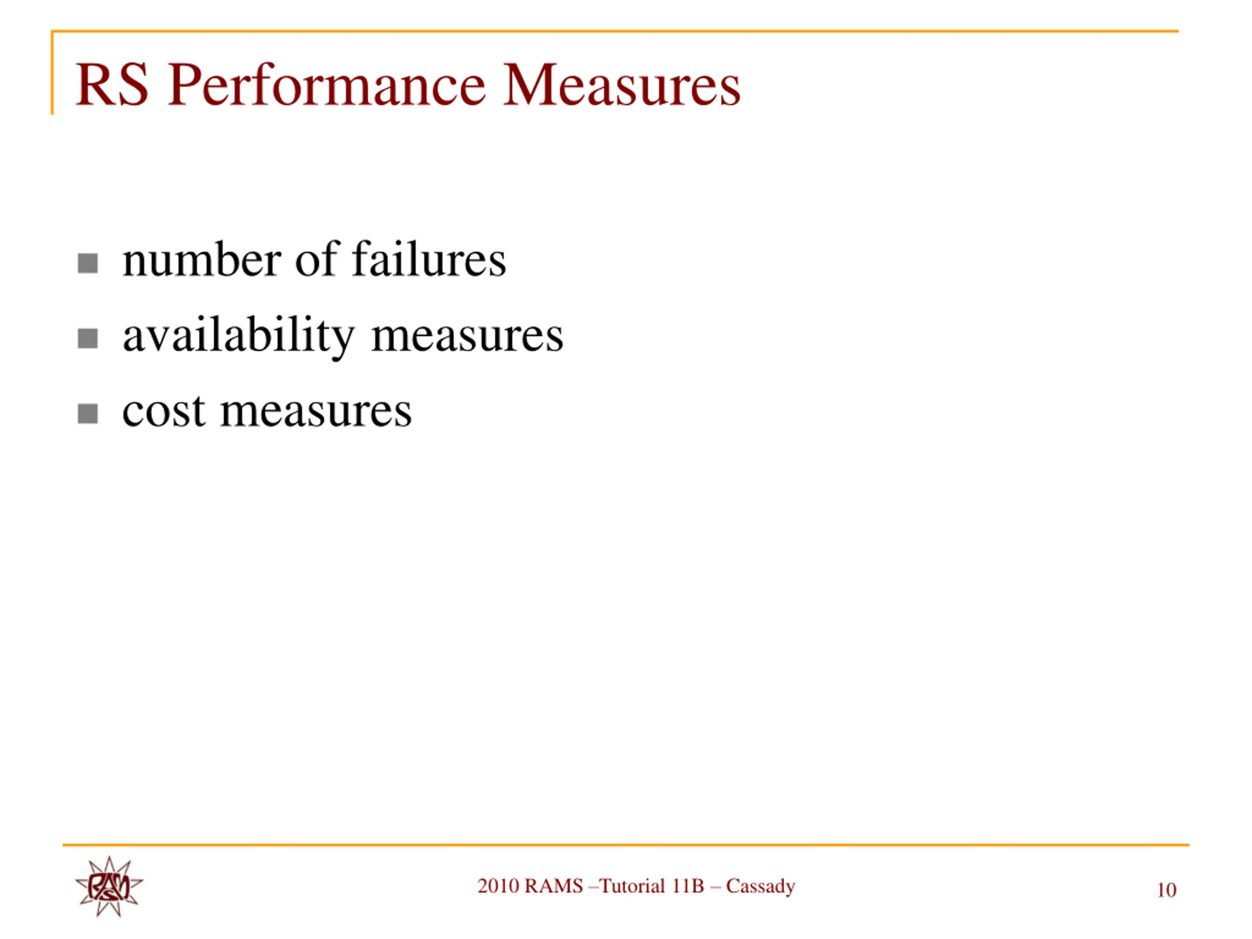 RS Performance Measures number of failures availability measures cost measures 2010 RAMS Tutorial 11B Cassady 10