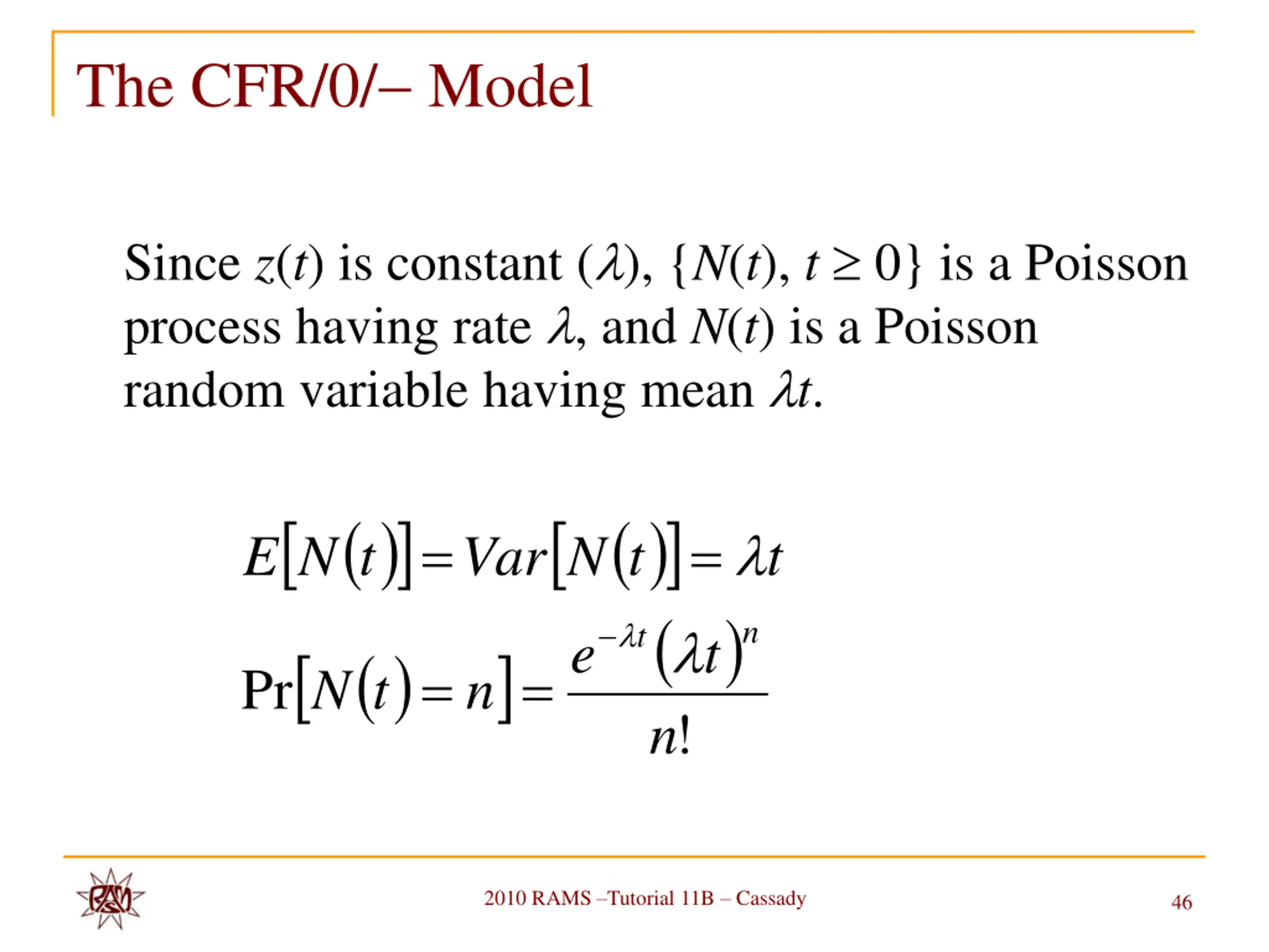 The CFR/0/ Model Since z(t) is constant ( ), {N(t), t 0} is a Poisson process having rate , and N(t) is a Poisson random variable having mean t. ( ) t ( ) t = = E N Var N t ( ) ! n n t e t ( ) t = = Pr N n 2010 RAMS Tutorial 11B Cassady 46