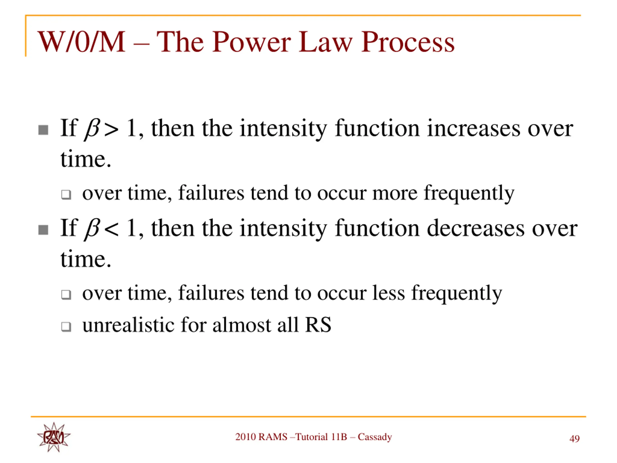 W/0/M The Power Law Process If > 1, then the intensity function increases over time. over time, failures tend to occur more frequently If < 1, then the intensity function decreases over time. over time, failures tend to occur less frequently unrealistic for almost all RS 2010 RAMS Tutorial 11B Cassady 49