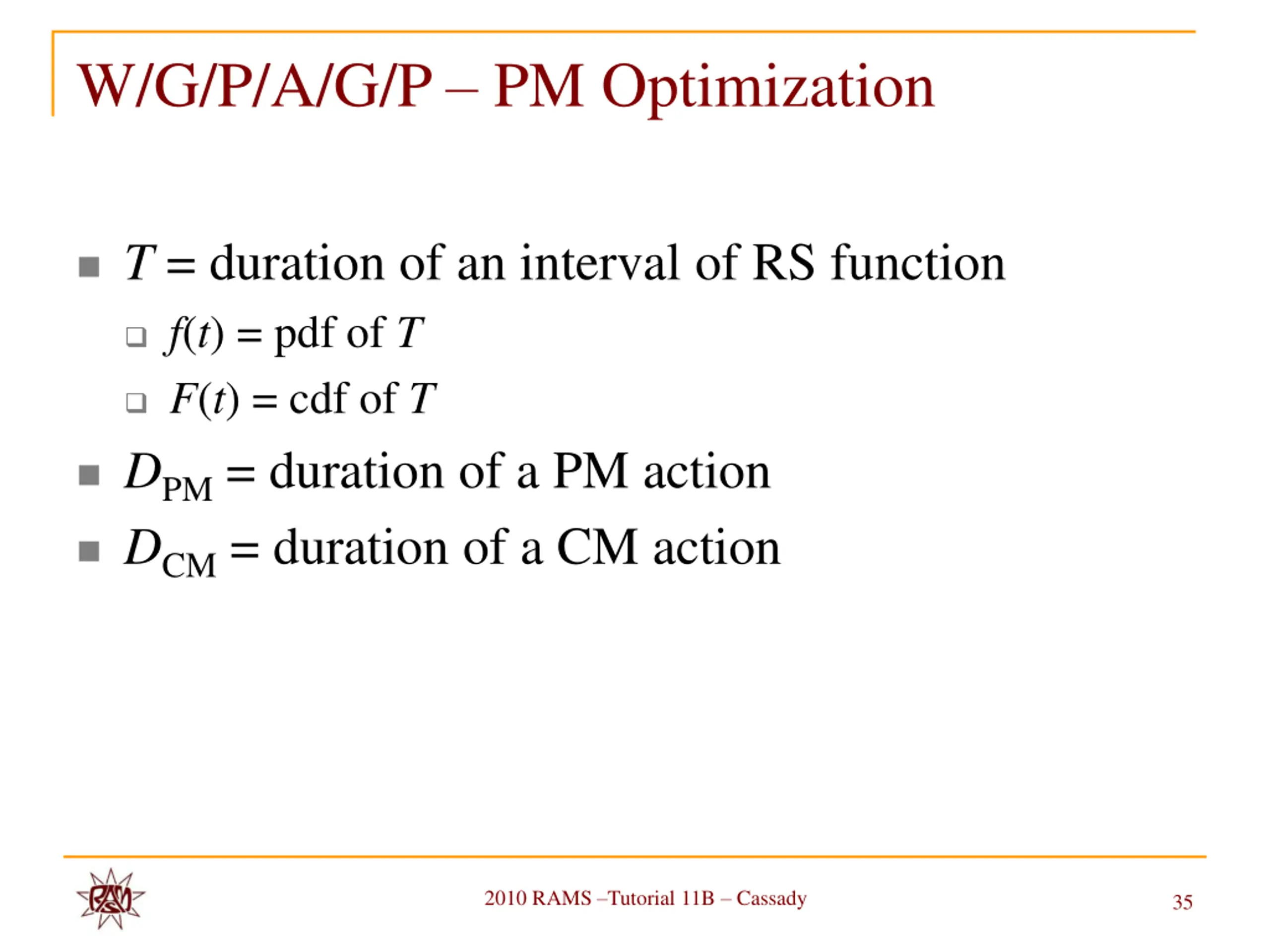W/G/P/A/G/P PM Optimization T = duration of an interval of RS function f(t) = pdf of T F(t) = cdf of T DPM = duration of a PM action DCM = duration of a CM action 2010 RAMS Tutorial 11B Cassady 35