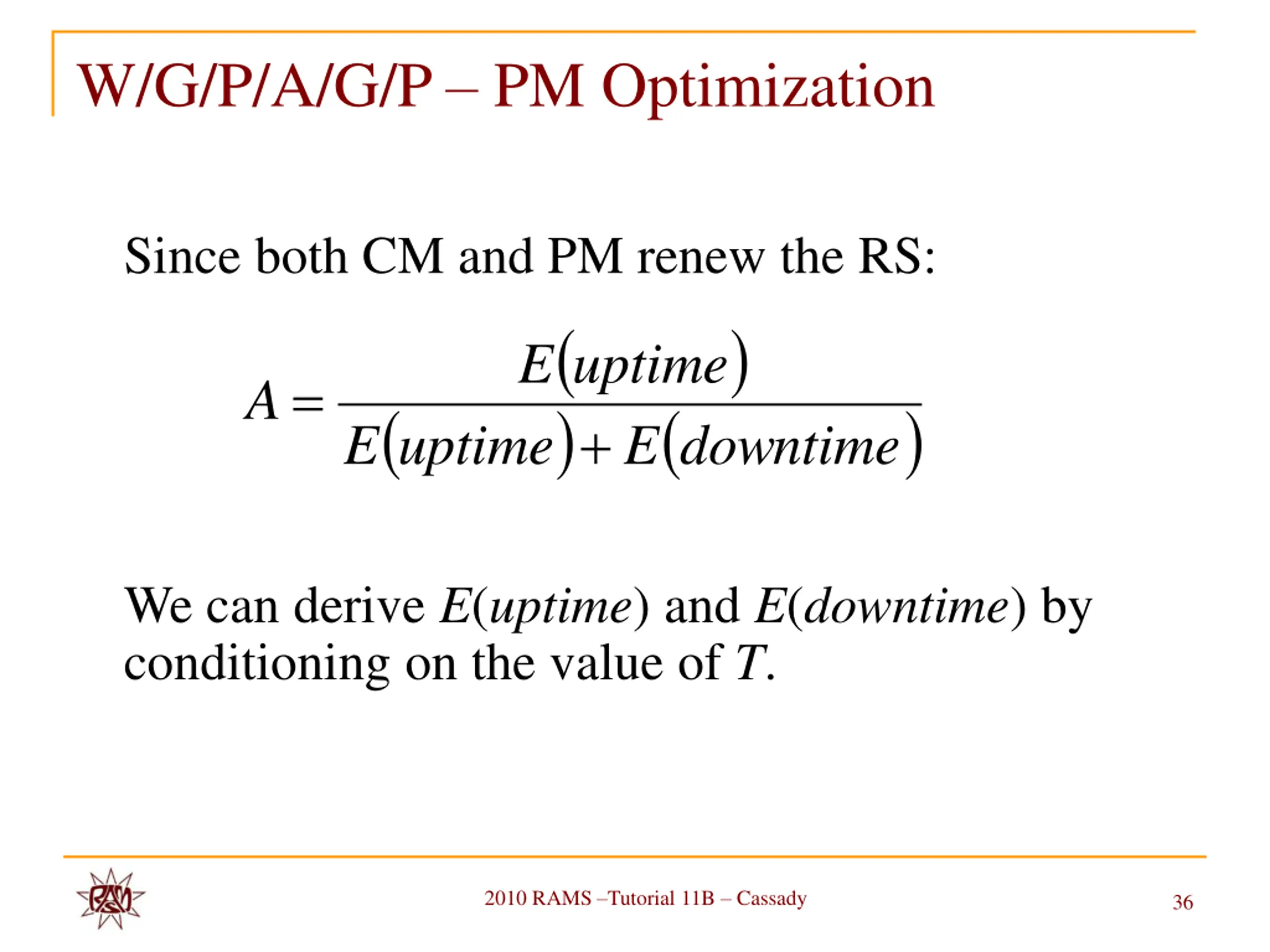 W/G/P/A/G/P PM Optimization Since both CM and PM renew the RS: ( ) ) E uptime + = A ( ( ) E uptime E downtime We can derive E(uptime) and E(downtime) by conditioning on the value of T. 2010 RAMS Tutorial 11B Cassady 36
