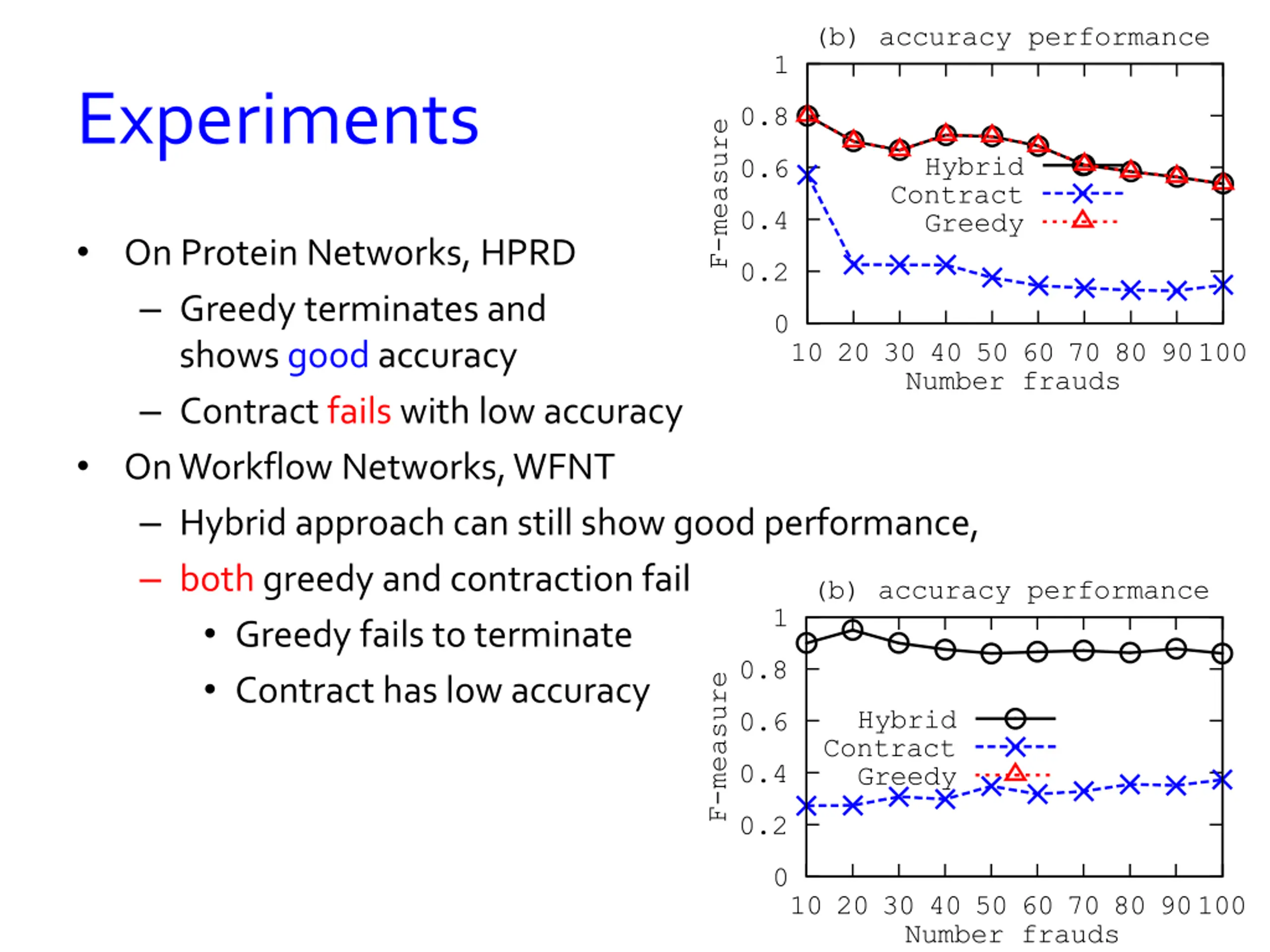 (b) accuracy performance 1 Experiments 0.8 F-measure Hybrid Contract Greedy 0.6 0.4 On Protein Networks, HPRD Greedy terminates and shows goodaccuracy Contract fails with low accuracy On Workflow Networks, WFNT Hybrid approach can still show good performance, both greedy and contraction fail Greedy fails to terminate Contract has low accuracy 0.2 0 10 20 30 40 50 60 70 80 90100 Number frauds (b) accuracy performance 1 0.8 F-measure Hybrid Contract Greedy 0.6 0.4 0.2 0 10 20 30 40 50 60 70 80 90100 Number frauds