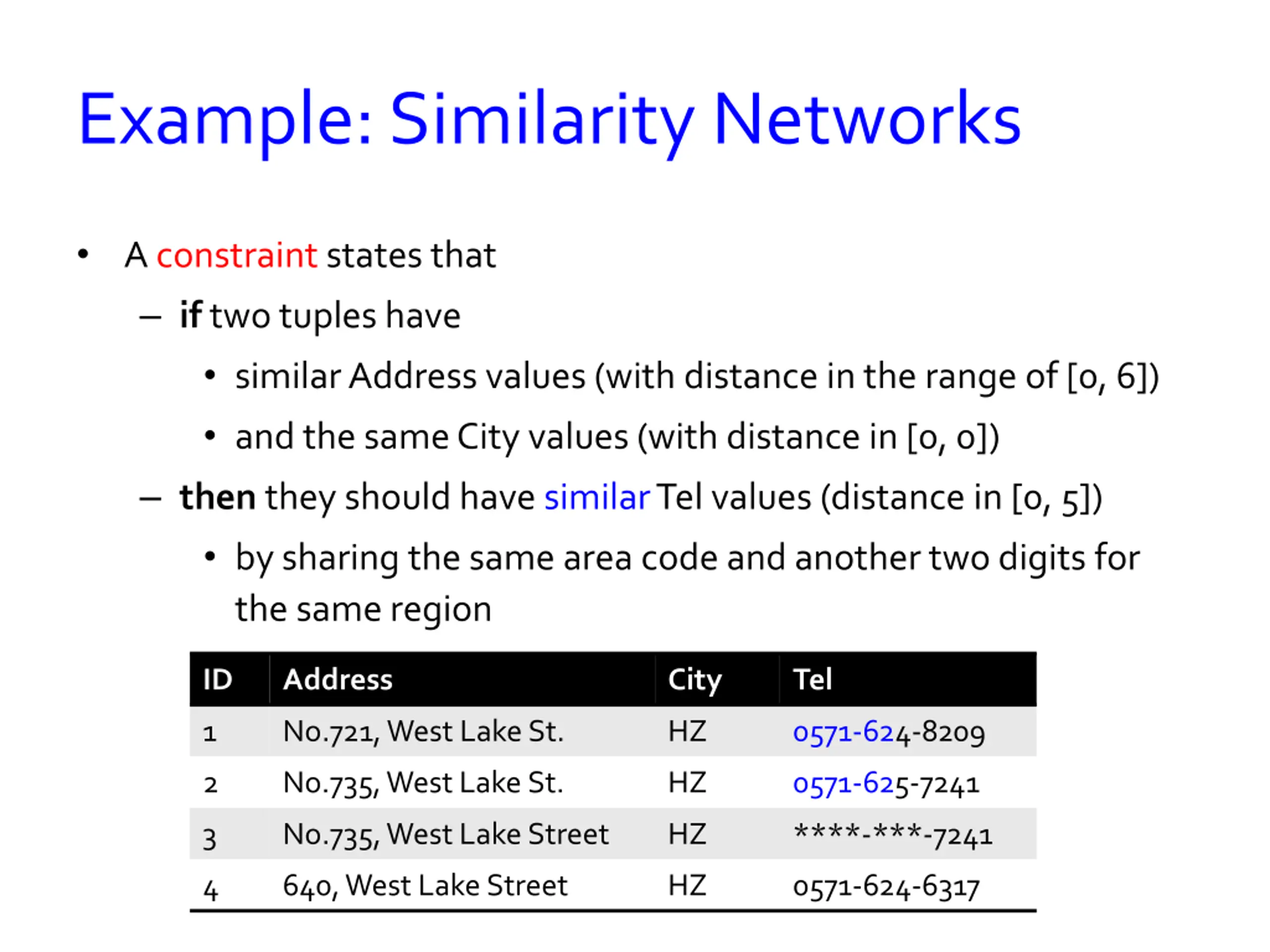 Example: Similarity Networks A constraint states that if two tuples have similar Address values (with distance in the range of [0, 6]) and the same City values (with distance in [0, 0]) then they should have similarTel values (distance in [0, 5]) by sharing the same area code and another two digits for the same region ID Address City Tel 1 No.721, West Lake St. HZ 0571-624-8209 2 No.735, West Lake St. HZ 0571-625-7241 3 No.735, West Lake Street HZ ****-***-7241 4 640, West Lake Street HZ 0571-624-6317