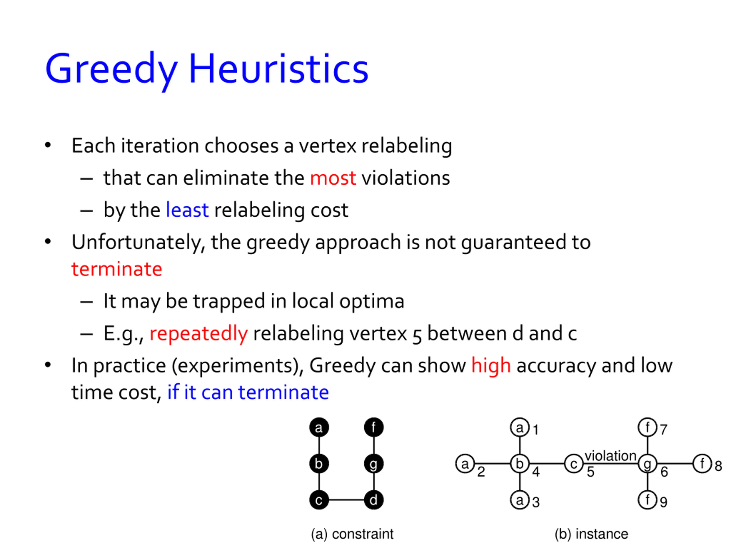 Greedy Heuristics Each iteration chooses a vertex relabeling that can eliminate the most violations by the least relabeling cost Unfortunately, the greedy approach is not guaranteed to terminate It may be trapped in local optima E.g., repeatedly relabeling vertex 5 between d and c In practice (experiments), Greedy can show high accuracy and low time cost, if it can terminate a f a f 1 7 violation c5 b g a b g f 8 2 4 6 c d a f 3 9 (a) constraint (b) instance