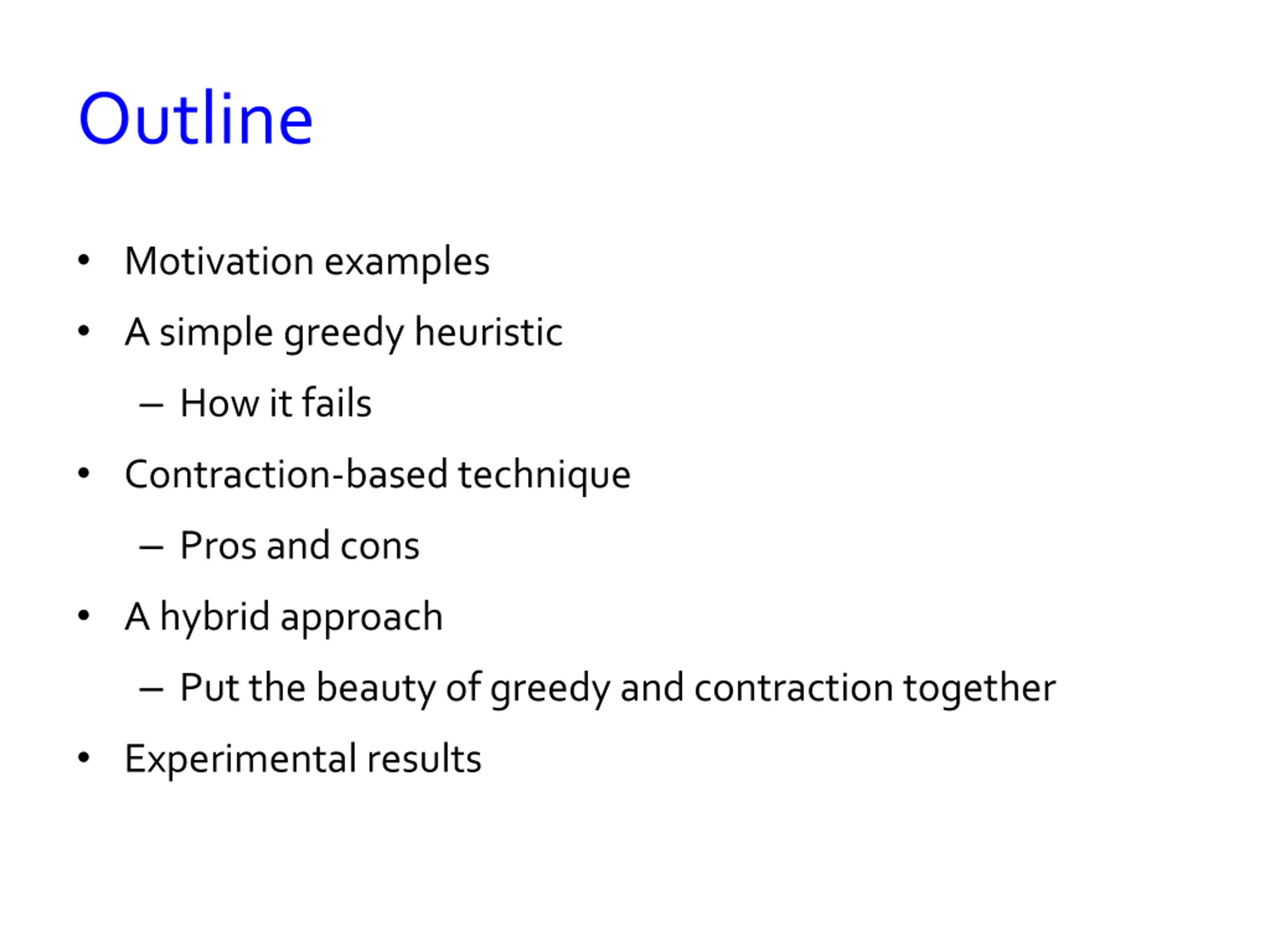 Outline Motivation examples A simple greedy heuristic How it fails Contraction-based technique Pros and cons A hybrid approach Put the beauty of greedy and contraction together Experimental results
