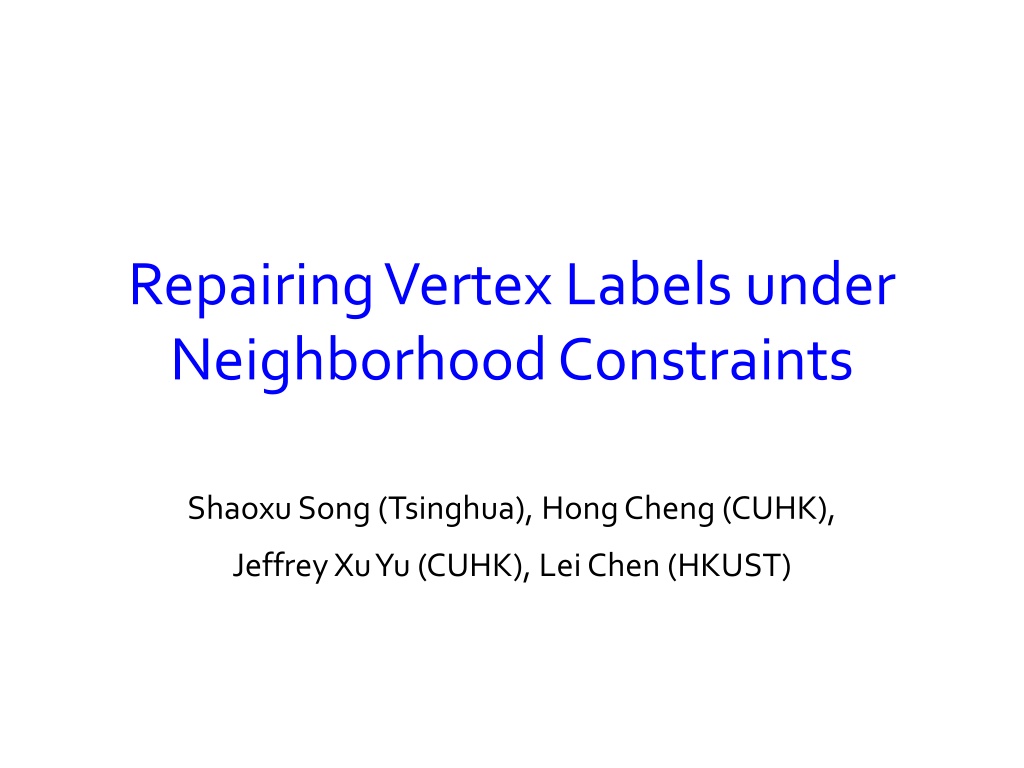 Repairing Vertex Labels under Neighborhood Constraints Shaoxu Song (Tsinghua), Hong Cheng (CUHK), Jeffrey XuYu(CUHK), Lei Chen (HKUST)