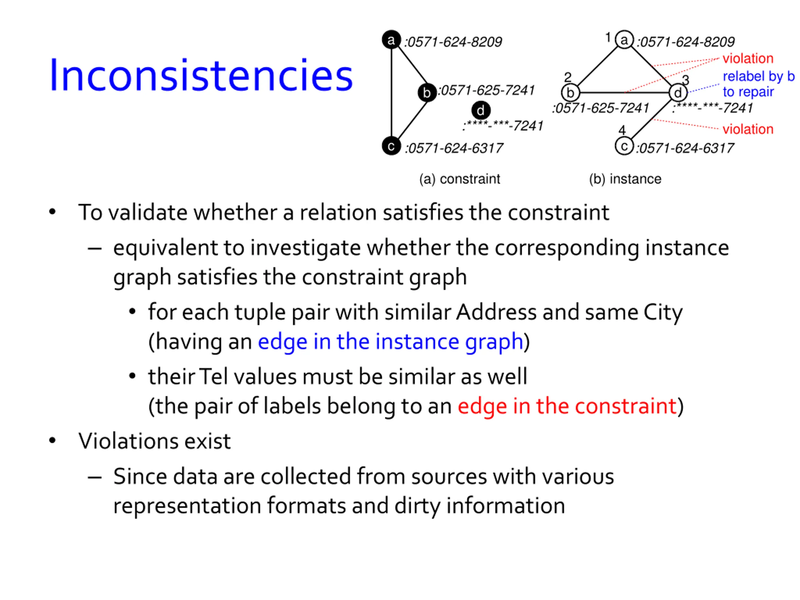 1 a a :0571-624-8209 :0571-624-8209 violation Inconsistencies relabel by b to repair 2 3 :0571-625-7241 b b d :****-***-7241 :0571-625-7241 d :****-***-7241 violation 4 c c :0571-624-6317 :0571-624-6317 (a) constraint (b) instance To validate whether a relation satisfies the constraint equivalent to investigate whether the corresponding instance graph satisfies the constraint graph for each tuple pair with similar Address and same City (having an edge in the instance graph) their Tel values must be similar as well (the pair of labels belong to an edge in the constraint) Violations exist Since data are collected from sources with various representation formats and dirty information