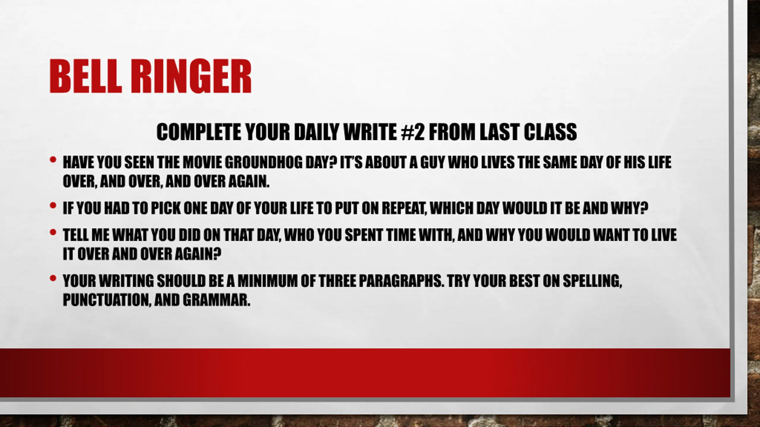 BELL RINGER COMPLETE YOUR DAILY WRITE #2 FROM LAST CLASS HAVE YOU SEEN THE MOVIE GROUNDHOG DAY? IT S ABOUT A GUY WHO LIVES THE SAME DAY OF HIS LIFE OVER, AND OVER, AND OVER AGAIN. IF YOU HAD TO PICK ONE DAY OF YOUR LIFE TO PUT ON REPEAT, WHICH DAY WOULD IT BE AND WHY? TELL ME WHAT YOU DID ON THAT DAY, WHO YOU SPENT TIME WITH, AND WHY YOU WOULD WANT TO LIVE IT OVER AND OVER AGAIN? YOUR WRITING SHOULD BE A MINIMUM OF THREE PARAGRAPHS. TRY YOUR BEST ON SPELLING, PUNCTUATION, AND GRAMMAR.
