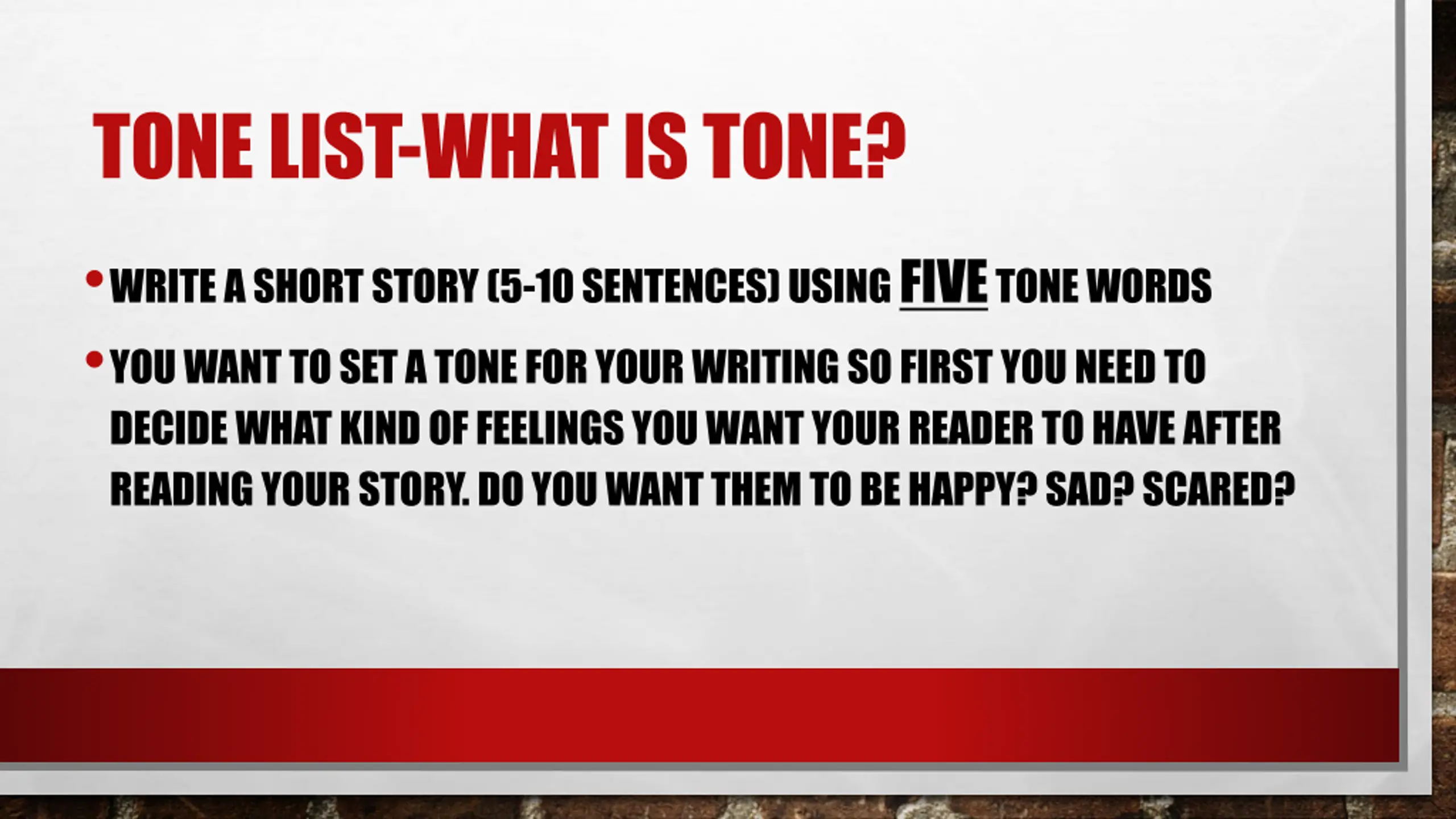 TONE LIST-WHAT IS TONE? WRITE A SHORT STORY (5-10 SENTENCES) USING FIVETONE WORDS YOU WANT TO SET A TONE FOR YOUR WRITING SO FIRST YOU NEED TO DECIDE WHAT KIND OF FEELINGS YOU WANT YOUR READER TO HAVE AFTER READING YOUR STORY. DO YOU WANT THEM TO BE HAPPY? SAD? SCARED?