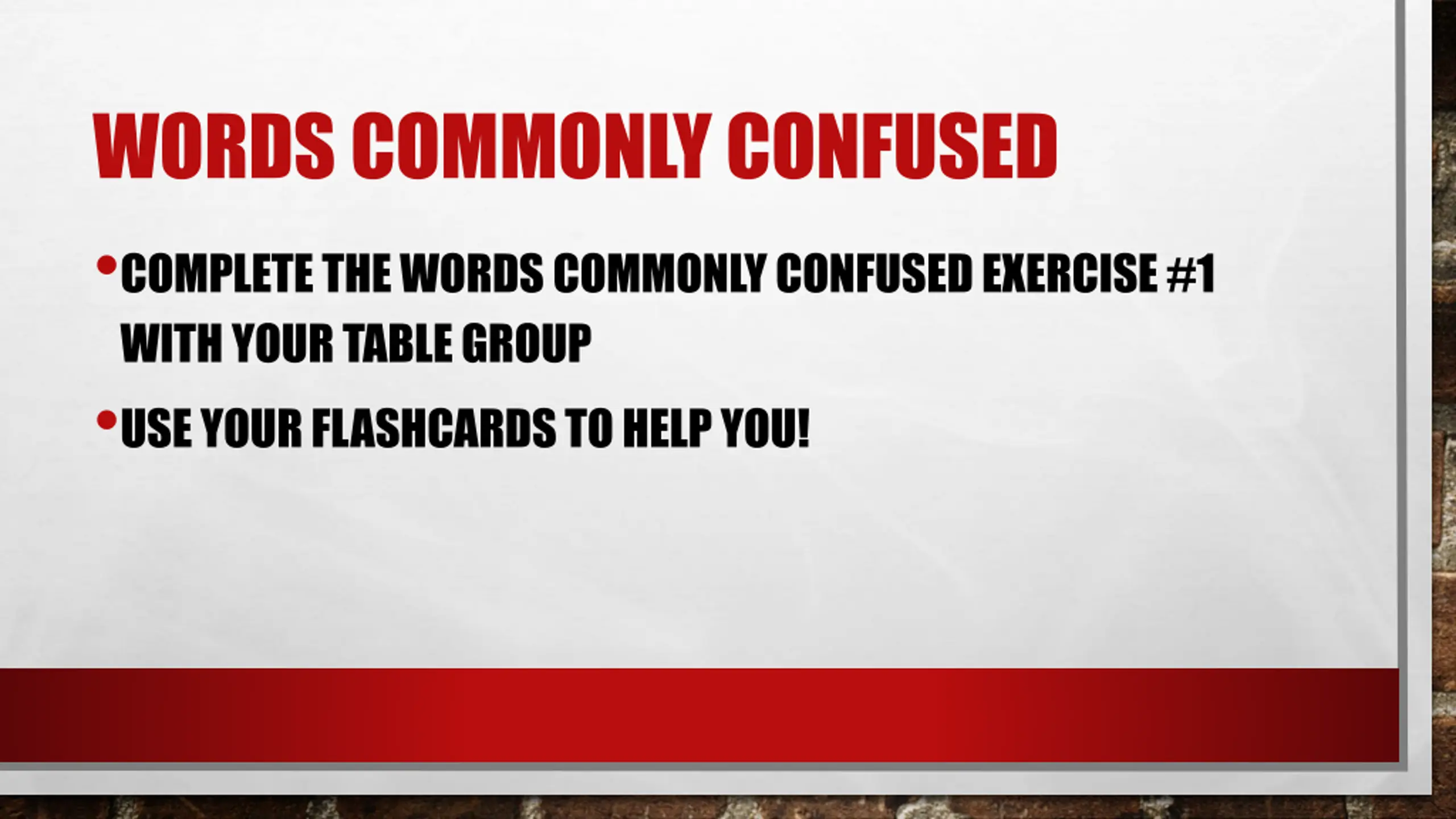 WORDS COMMONLY CONFUSED COMPLETE THE WORDS COMMONLY CONFUSED EXERCISE #1 WITH YOUR TABLE GROUP USE YOUR FLASHCARDS TO HELP YOU!