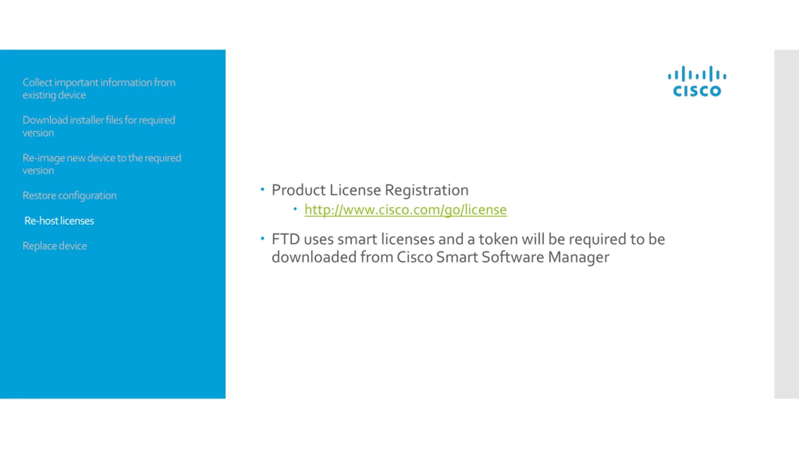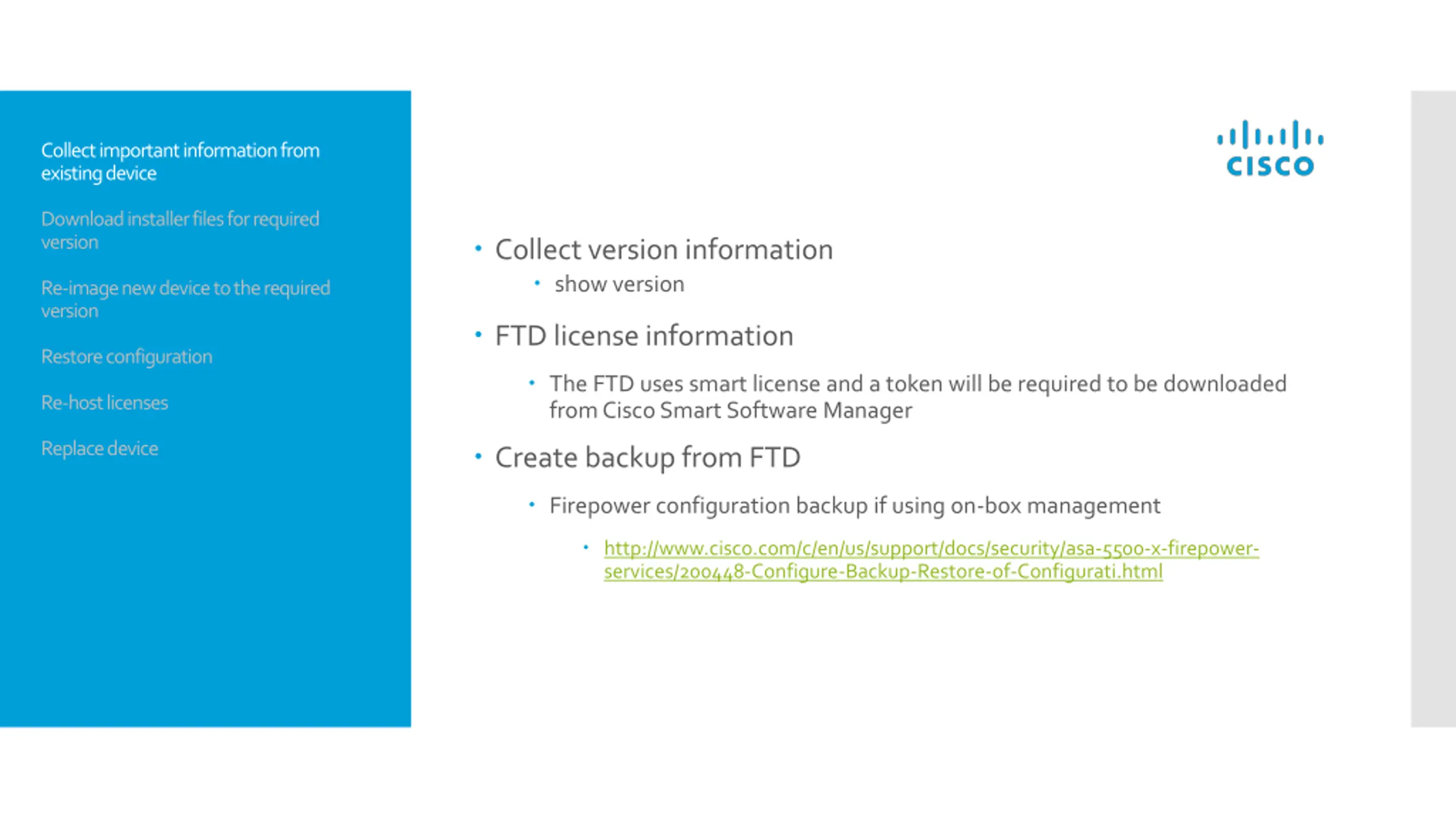 Collect important information from existing device Download installer files for required version Re-image new device to the required version Product License Registration http://www.cisco.com/go/license Restore configuration Re-host licenses FTD uses smart licenses and a token will be required to be downloaded from Cisco Smart Software Manager Replace device