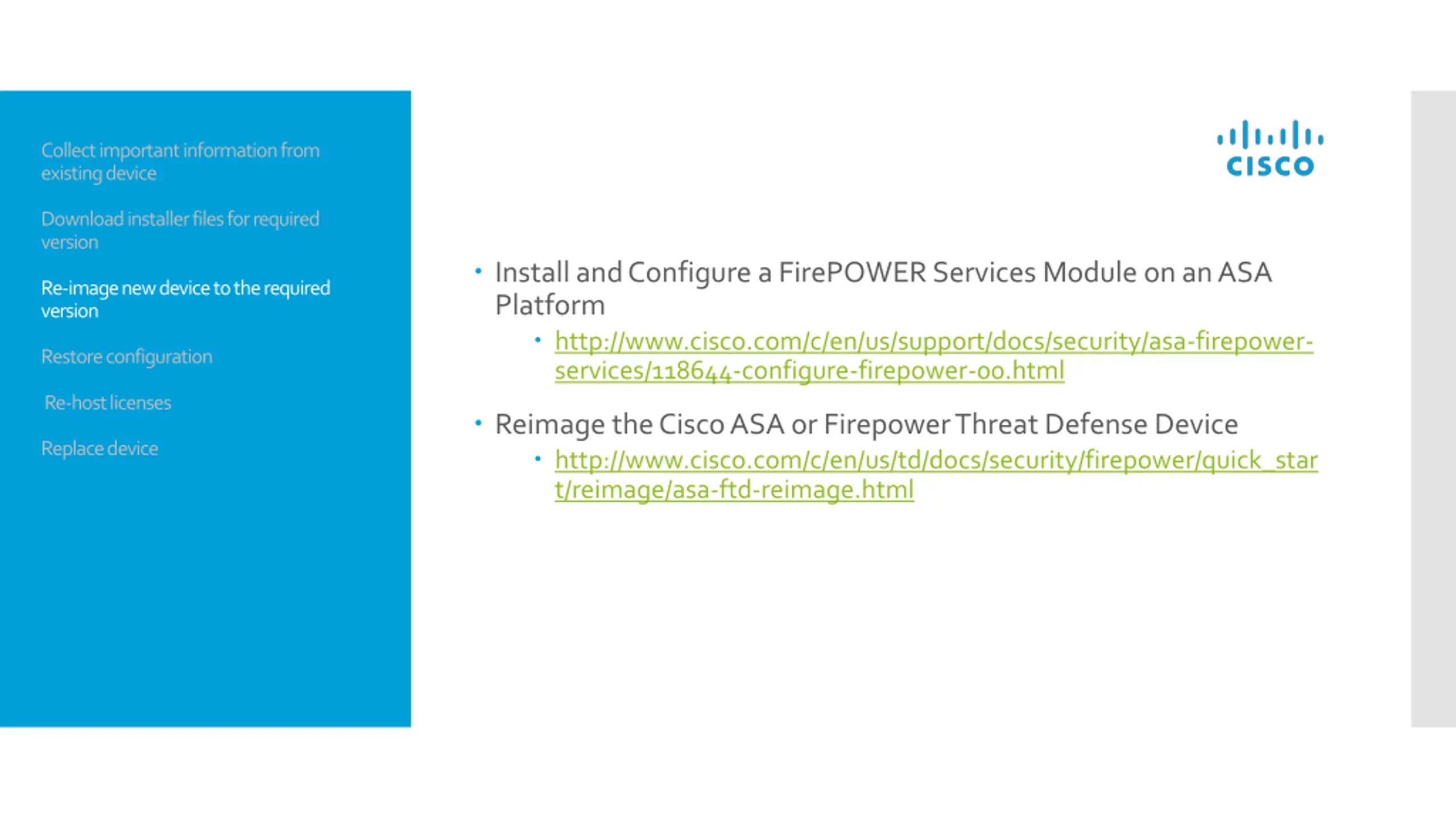 Collect important information from existing device Download installer files for required version Install and Configure a FirePOWER Services Module on an ASA Platform http://www.cisco.com/c/en/us/support/docs/security/asa-firepower- services/118644-configure-firepower-00.html Re-image new device to the required version Restore configuration Re-host licenses Reimage the Cisco ASA or Firepower Threat Defense Device http://www.cisco.com/c/en/us/td/docs/security/firepower/quick_star t/reimage/asa-ftd-reimage.html Replace device
