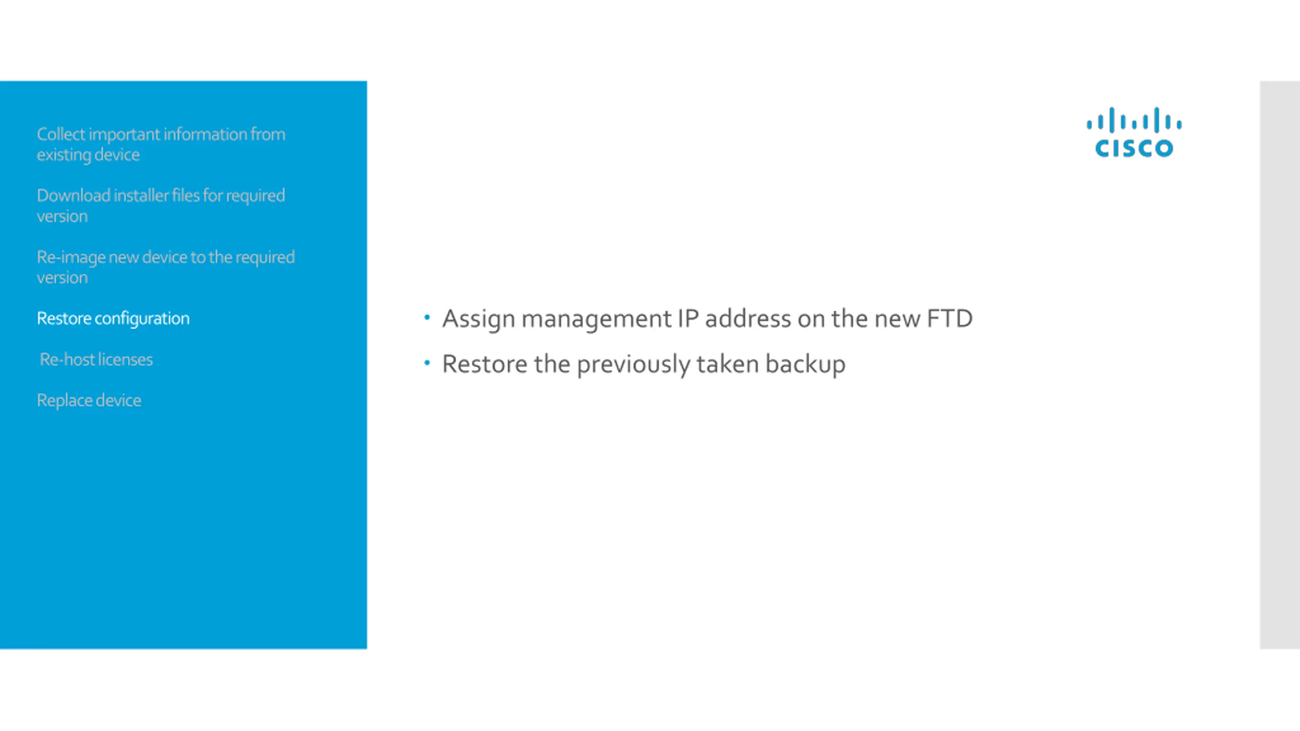 Collect important information from existing device Download installer files for required version Re-image new device to the required version Assign management IP address on the new FTD Restore configuration Restore the previously taken backup Re-host licenses Replace device