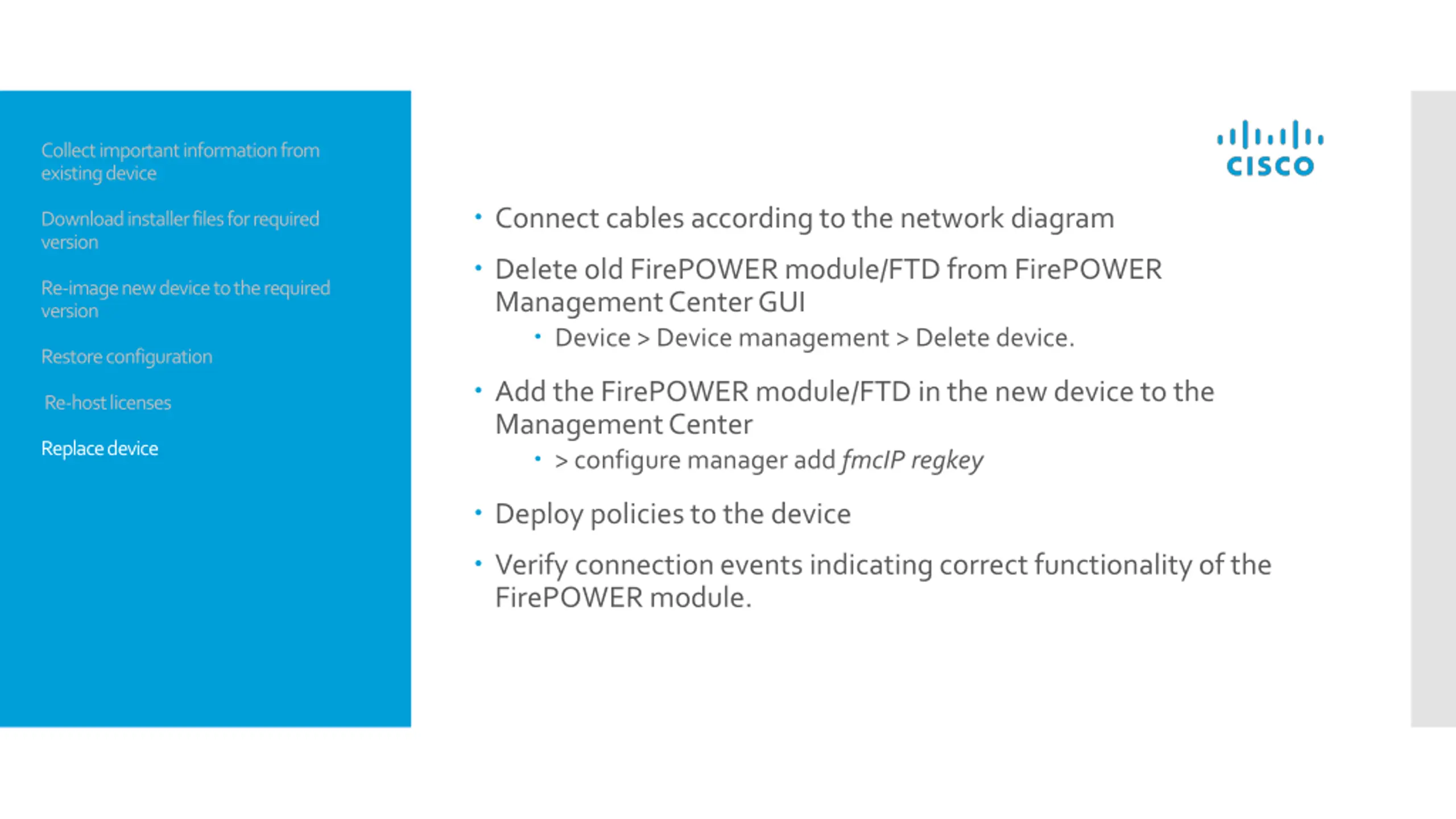 Collect important information from existing device Connect cables according to the network diagram Download installer files for required version Delete old FirePOWER module/FTD from FirePOWER Management Center GUI Device > Device management > Delete device. Re-image new device to the required version Restore configuration Add the FirePOWER module/FTD in the new device to the Management Center > configure manager add fmcIP regkey Re-host licenses Replace device Deploy policies to the device Verify connection events indicating correct functionality of the FirePOWER module.