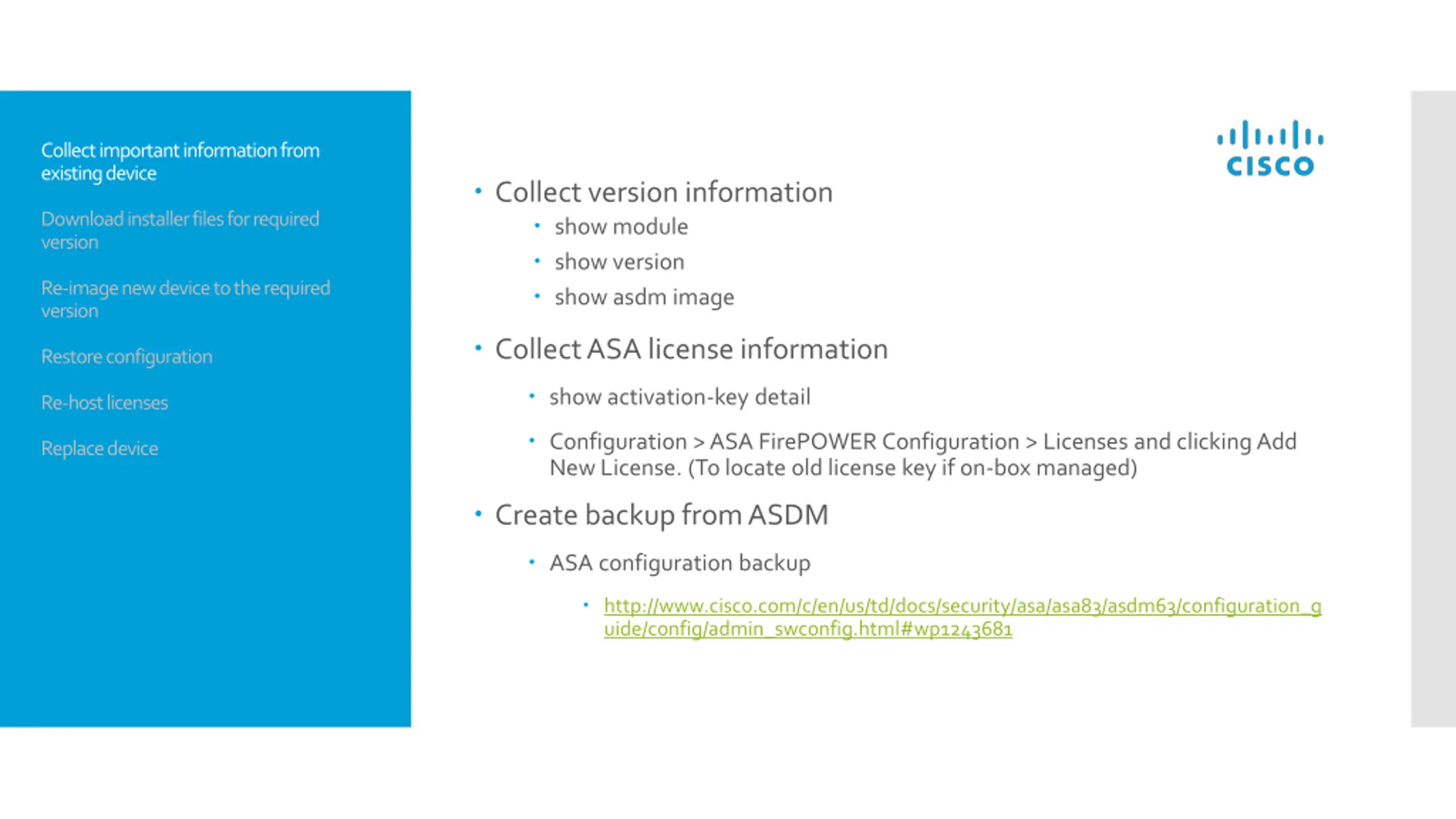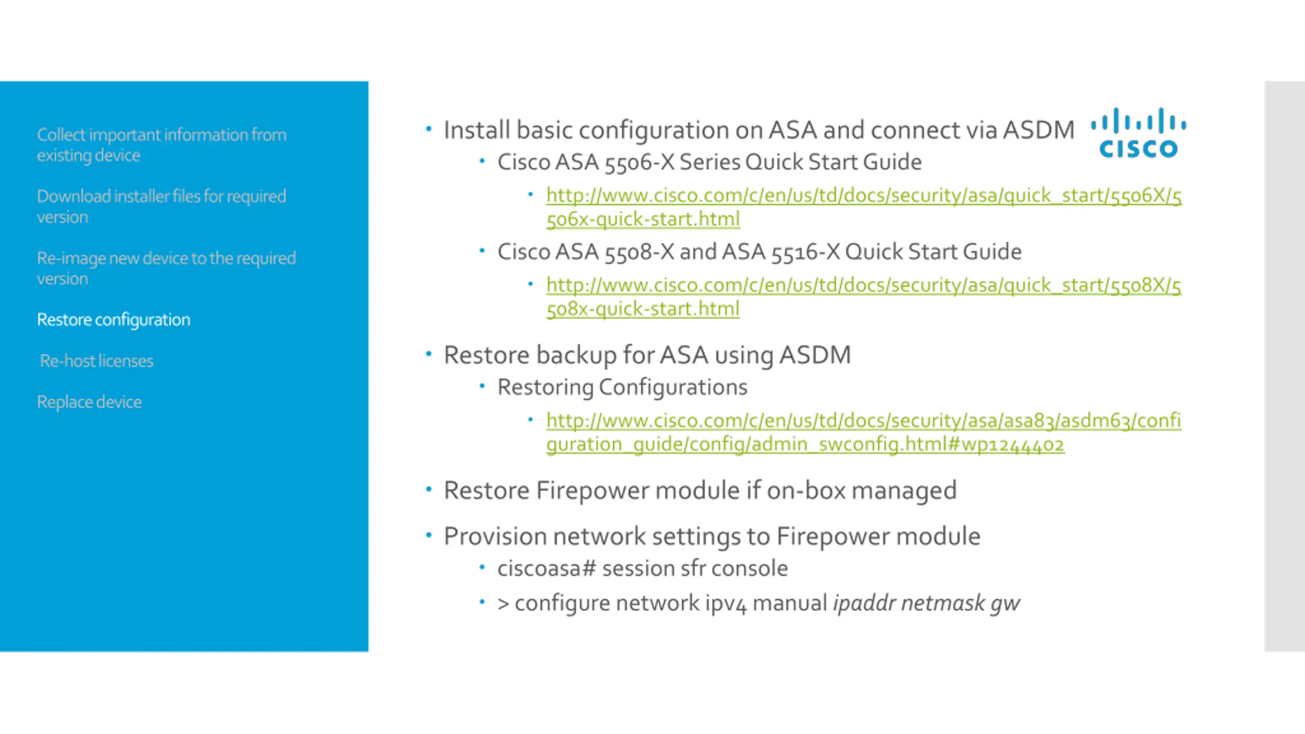 Install basic configuration on ASA and connect via ASDM Cisco ASA 5506-X Series Quick Start Guide http://www.cisco.com/c/en/us/td/docs/security/asa/quick_start/5506X/5 506x-quick-start.html Cisco ASA 5508-X and ASA 5516-X Quick Start Guide http://www.cisco.com/c/en/us/td/docs/security/asa/quick_start/5508X/5 508x-quick-start.html Collect important information from existing device Download installer files for required version Re-image new device to the required version Restore configuration Restore backup for ASA using ASDM Restoring Configurations http://www.cisco.com/c/en/us/td/docs/security/asa/asa83/asdm63/confi guration_guide/config/admin_swconfig.html#wp1244402 Re-host licenses Replace device Restore Firepower module if on-box managed Provision network settings to Firepower module ciscoasa# session sfr console > configure network ipv4 manual ipaddrnetmaskgw