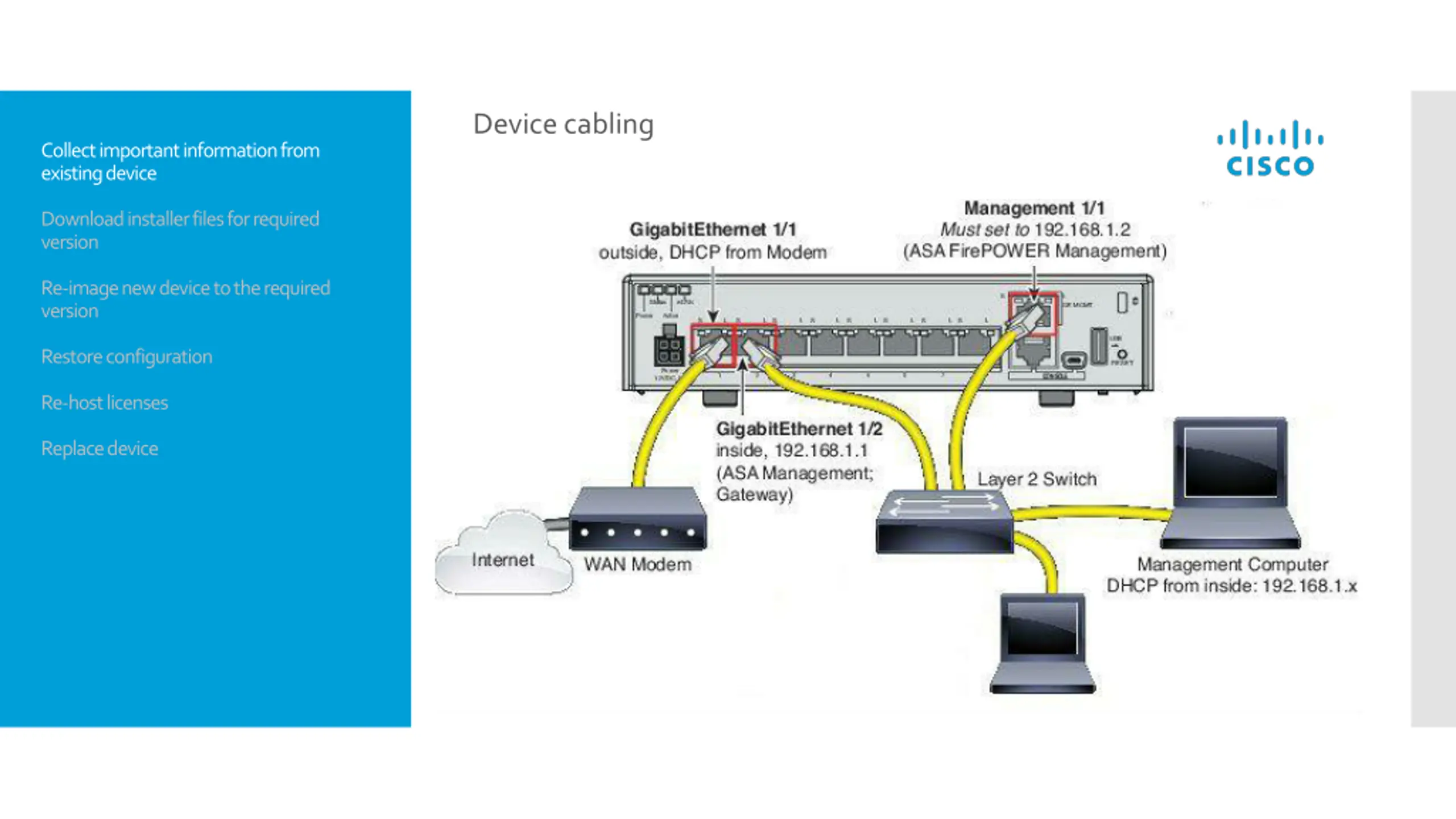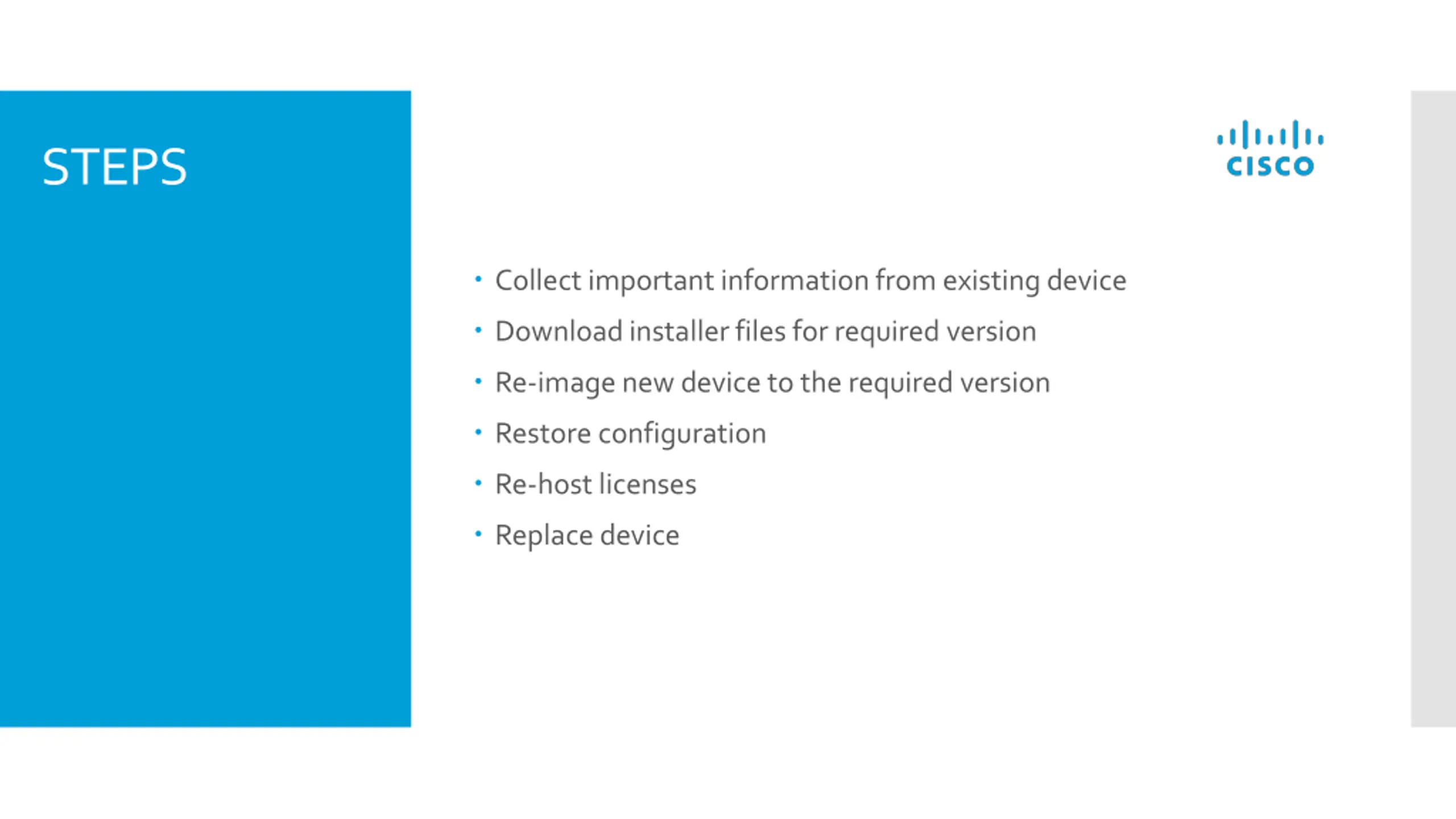 STEPS Collect important information from existing device Download installer files for required version Re-image new device to the required version Restore configuration Re-host licenses Replace device