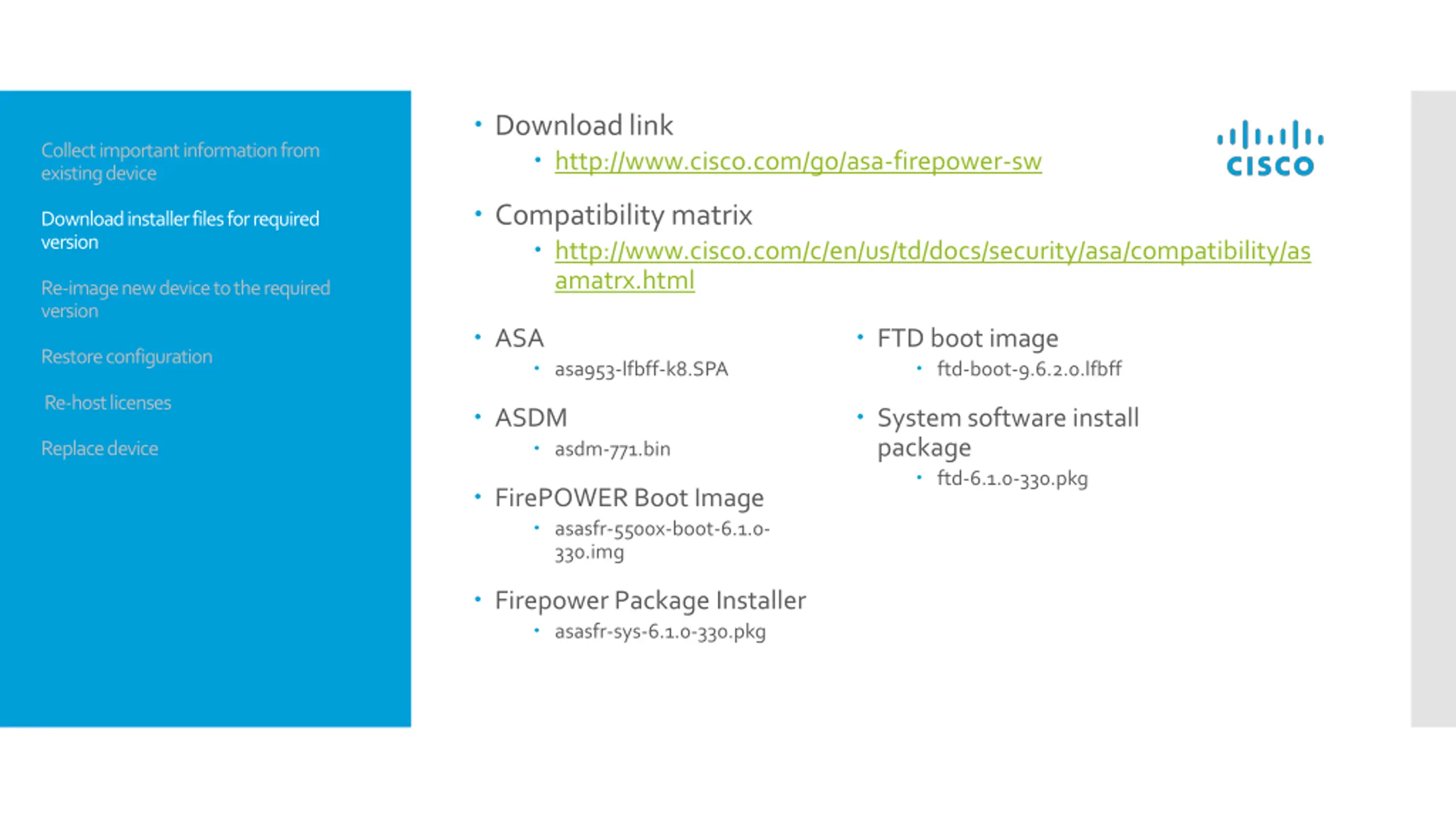 Download link http://www.cisco.com/go/asa-firepower-sw Collect important information from existing device Compatibility matrix http://www.cisco.com/c/en/us/td/docs/security/asa/compatibility/as amatrx.html Download installer files for required version Re-image new device to the required version ASA FTD boot image ftd-boot-9.6.2.0.lfbff Restore configuration asa953-lfbff-k8.SPA Re-host licenses ASDM System software install package ftd-6.1.0-330.pkg asdm-771.bin Replace device FirePOWER Boot Image asasfr-5500x-boot-6.1.0- 330.img FirepowerPackage Installer asasfr-sys-6.1.0-330.pkg