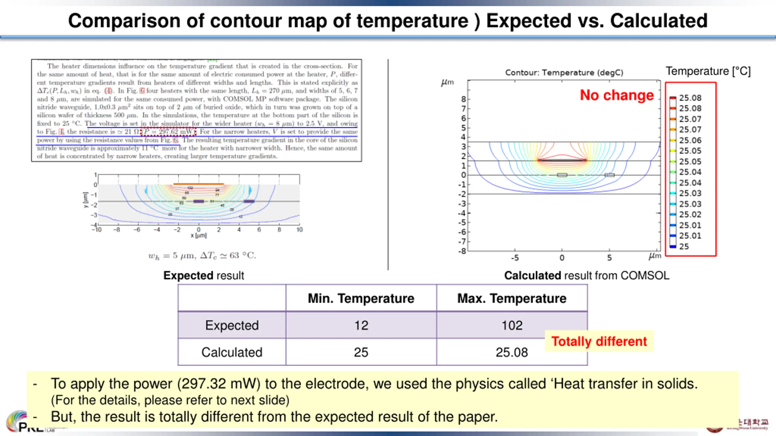 Comparison of contour map of temperature ) Expected vs. Calculated Temperature [ C] No change Expected result Calculated result from COMSOL Min. Temperature Max. Temperature Expected 12 102 Totally different Calculated 25 25.08 - To apply the power (297.32 mW) to the electrode, we used the physics called Heat transfer in solids. (For the details, please refer to next slide) But, the result is totally different from the expected result of the paper. -