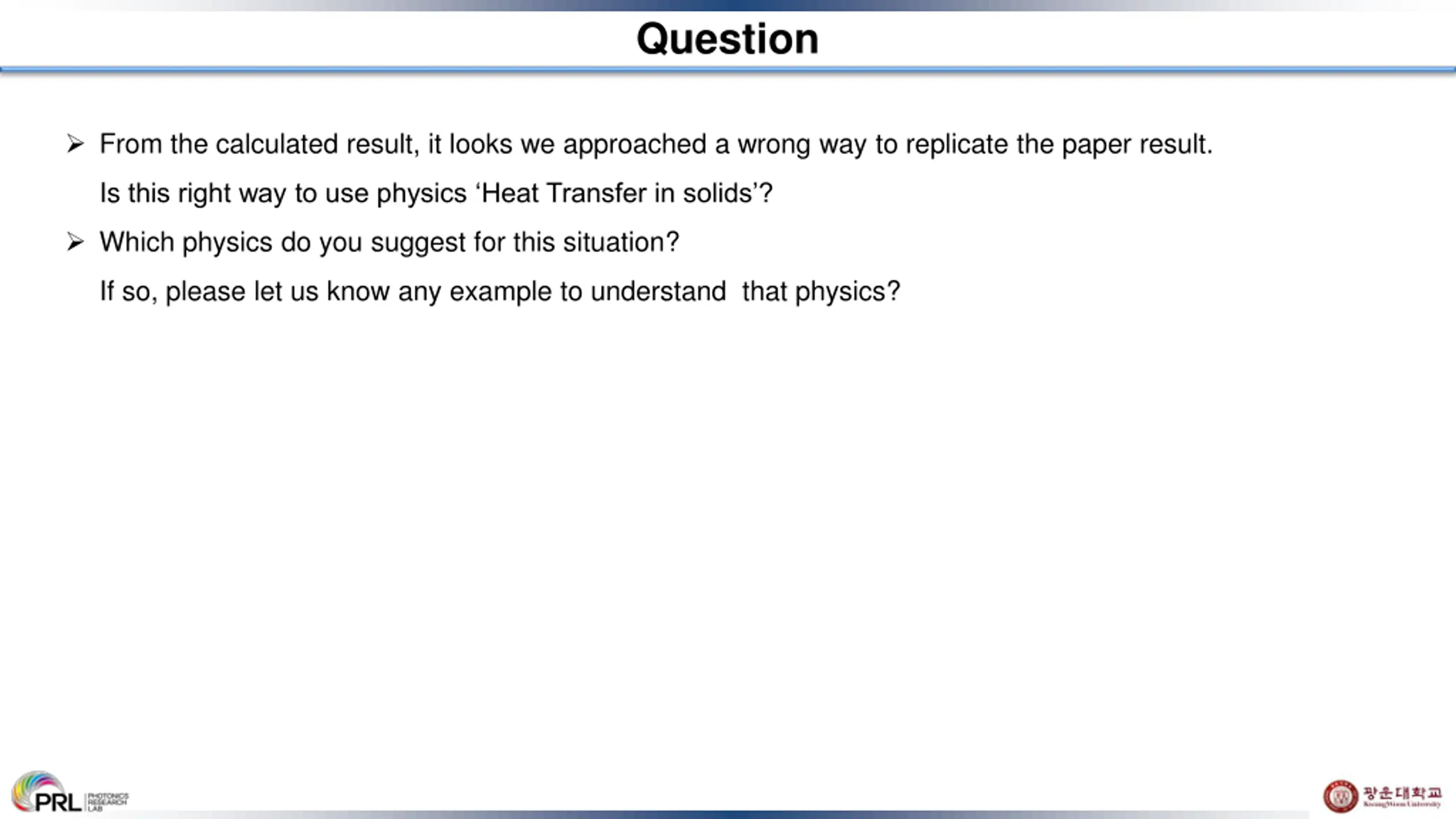 Question From the calculated result, it looks we approached a wrong way to replicate the paper result. Is this right way to use physics Heat Transfer in solids ? Which physics do you suggest for this situation? If so, please let us know any example to understand that physics?