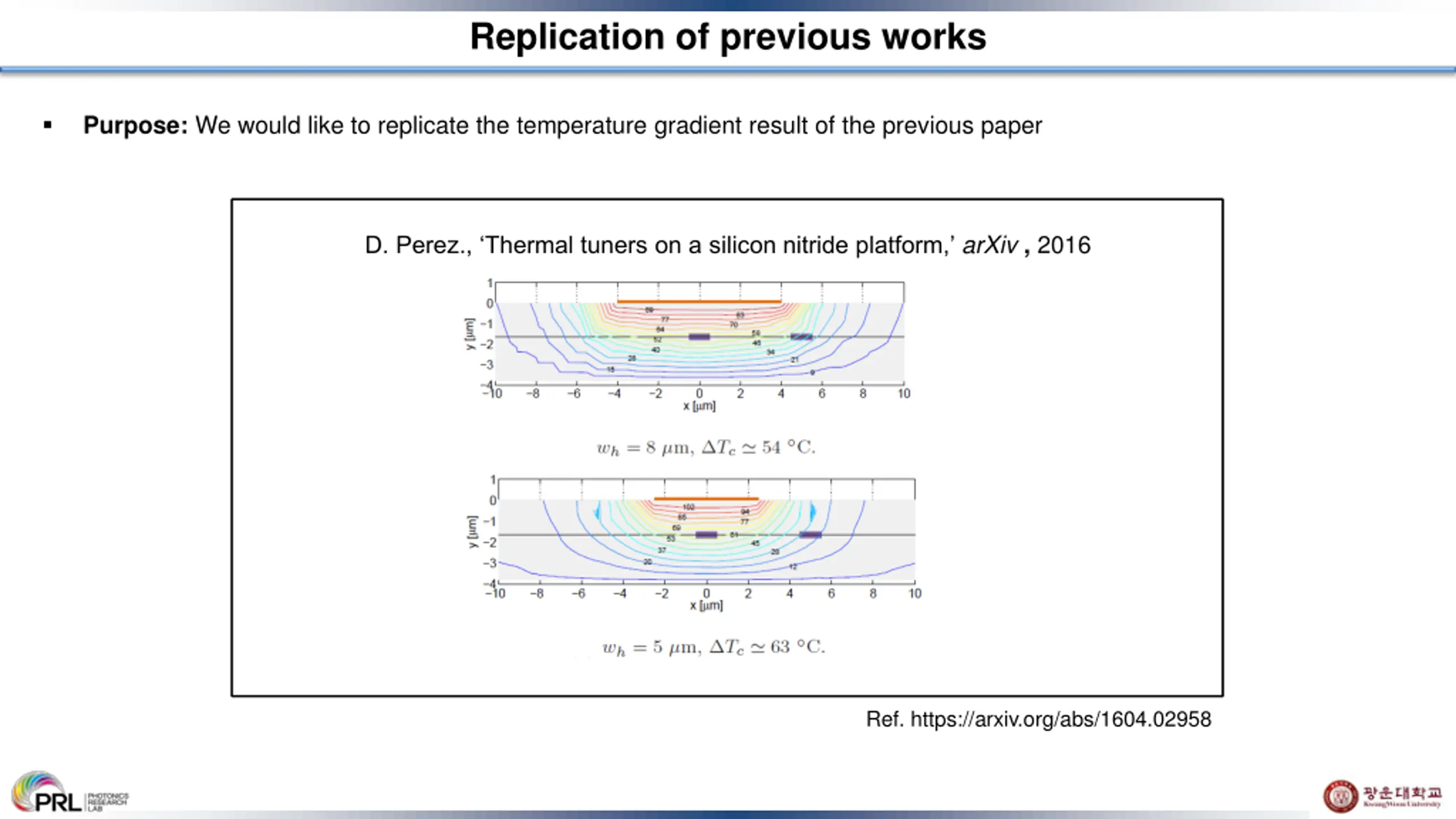 Replication of previous works Purpose: We would like to replicate the temperature gradient result of the previous paper D. Perez., Thermal tuners on a silicon nitride platform, arXiv , 2016 Ref. https://arxiv.org/abs/1604.02958