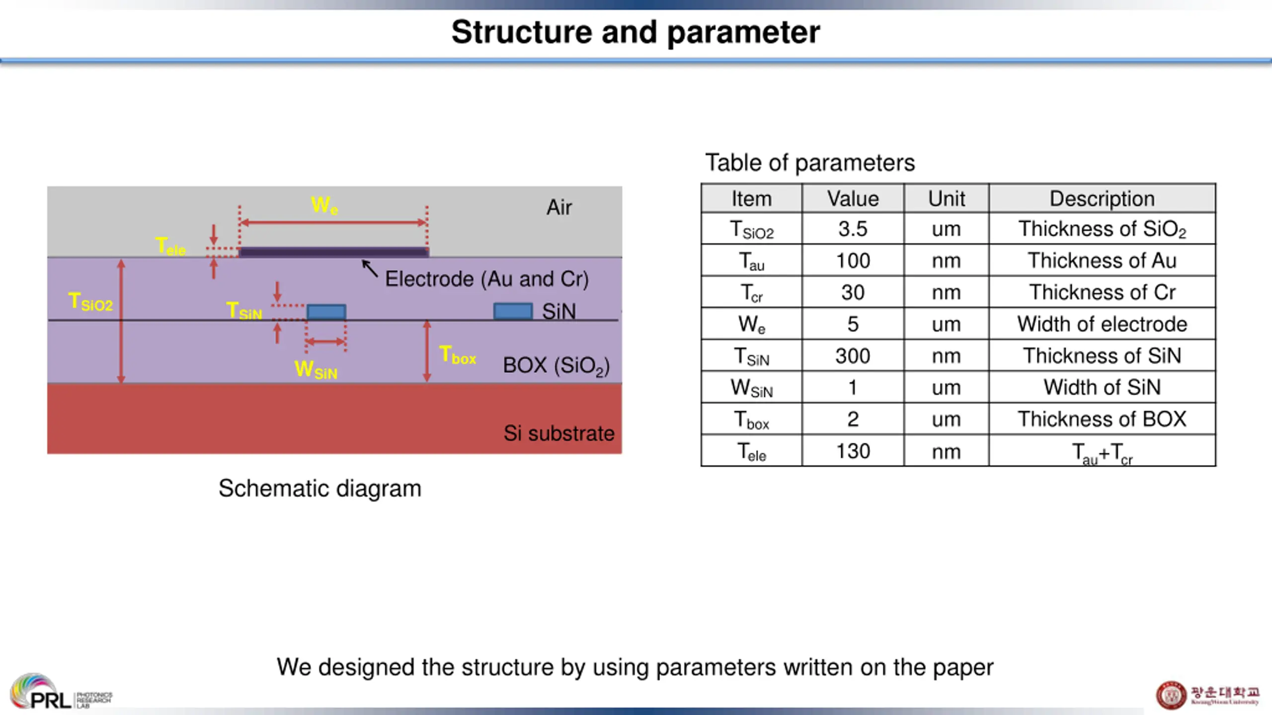 Structure and parameter Table of parameters Item TSiO2 Tau Tcr We TSiN WSiN Tbox Tele Value 3.5 100 30 5 300 1 2 130 Unit um nm nm um nm um um nm Description Thickness of SiO2 Thickness of Au Thickness of Cr Width of electrode Thickness of SiN Width of SiN Thickness of BOX Tau+Tcr We Air Tele Electrode (Au and Cr) TSiO2 TSiN SiN Tbox BOX (SiO2) WSiN Si substrate Schematic diagram We designed the structure by using parameters written on the paper