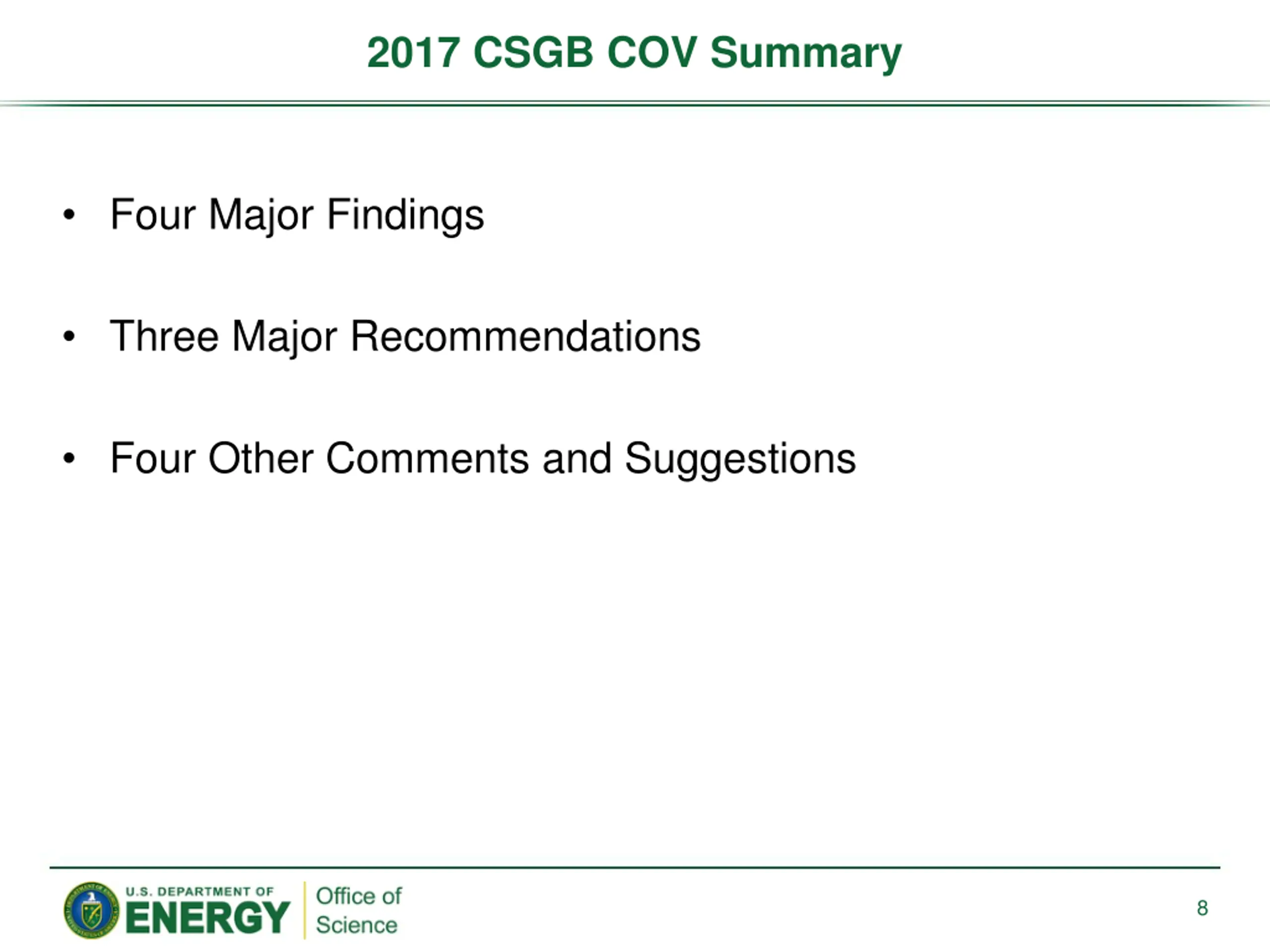 2017 CSGB COV Summary Four Major Findings Three Major Recommendations Four Other Comments and Suggestions 8
