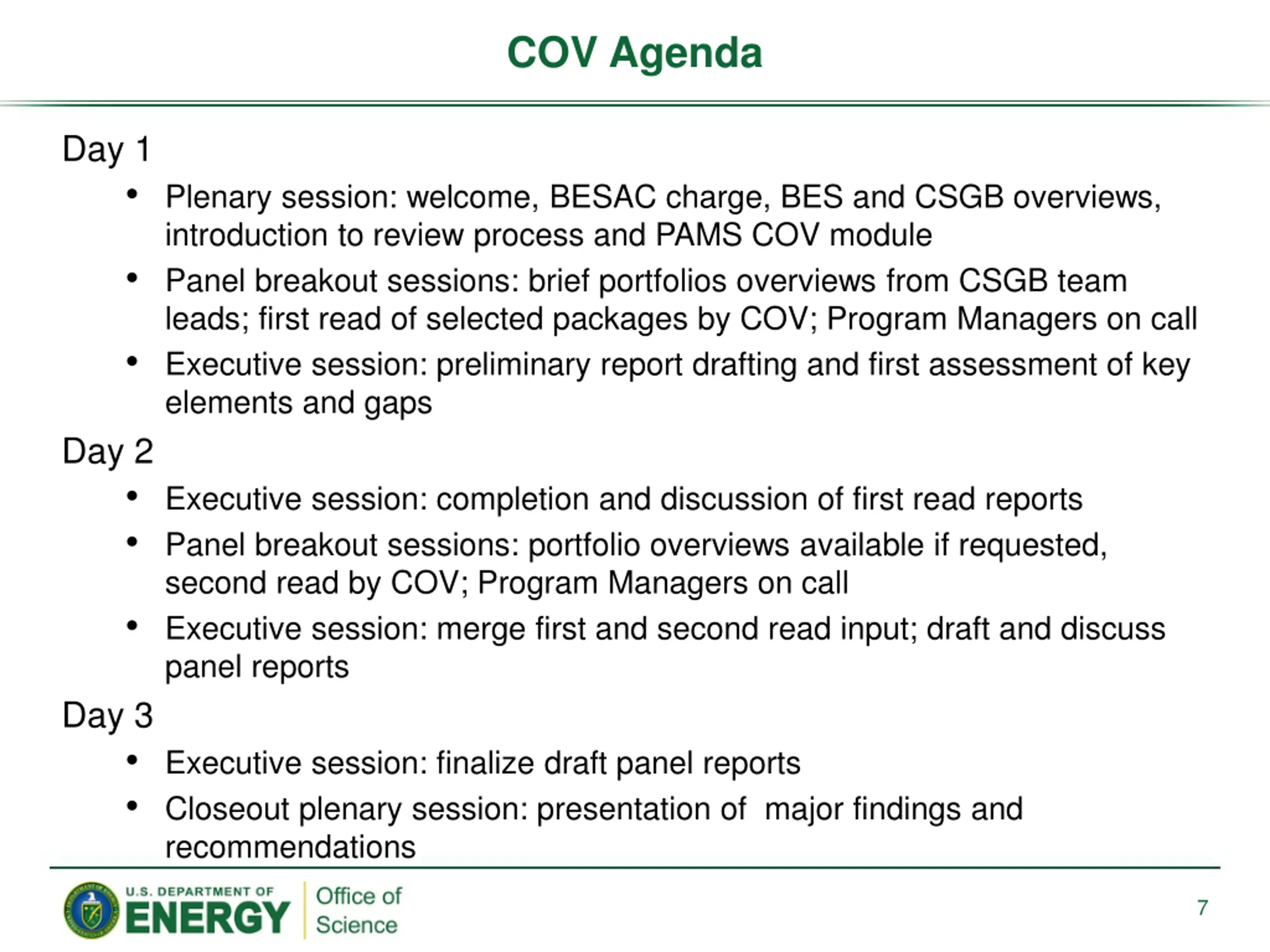 COV Agenda Day 1 Plenary session: welcome, BESAC charge, BES and CSGB overviews, introduction to review process and PAMS COV module Panel breakout sessions: brief portfolios overviews from CSGB team leads; first read of selected packages by COV; Program Managers on call Executive session: preliminary report drafting and first assessment of key elements and gaps Day 2 Executive session: completion and discussion of first read reports Panel breakout sessions: portfolio overviews available if requested, second read by COV; Program Managers on call Executive session: merge first and second read input; draft and discuss panel reports Day 3 Executive session: finalize draft panel reports Closeout plenary session: presentation of major findings and recommendations 7