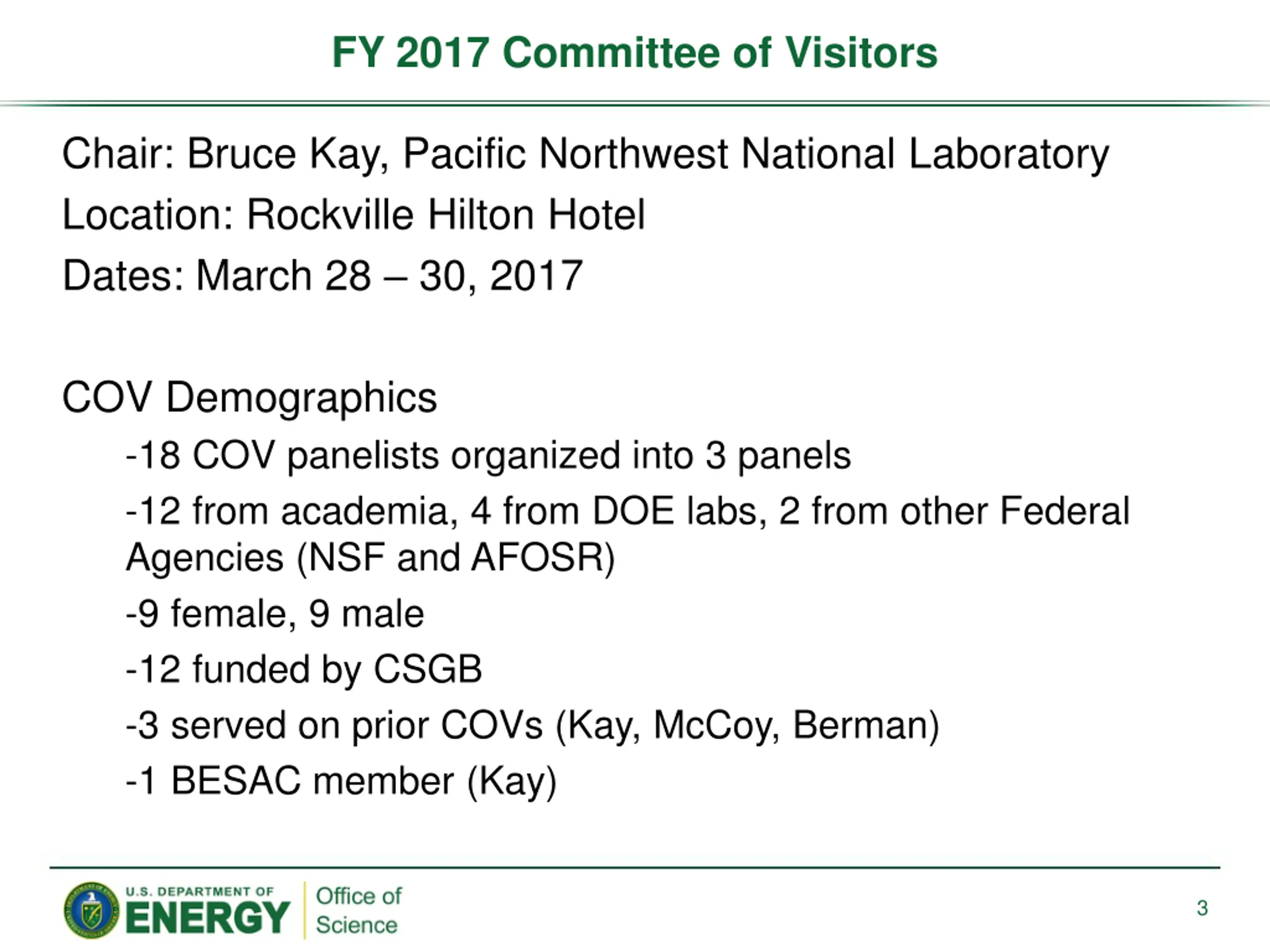 FY 2017 Committee of Visitors Chair: Bruce Kay, Pacific Northwest National Laboratory Location: Rockville Hilton Hotel Dates: March 28 30, 2017 COV Demographics -18 COV panelists organized into 3 panels -12 from academia, 4 from DOE labs, 2 from other Federal Agencies (NSF and AFOSR) -9 female, 9 male -12 funded by CSGB -3 served on prior COVs (Kay, McCoy, Berman) -1 BESAC member (Kay) 3
