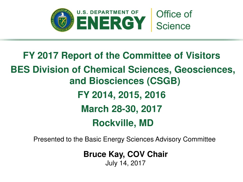 Explore the findings and demographics of the FY 2017 Committee of Visitors in the Chemical Sciences, Geosciences, and Biosciences (CSGB) Division. Learn about the panel structure, members, and the assessment of DOE laboratory and university projects. Discover the impact on the national and international standing of portfolio elements and the efficacy of processes used.
