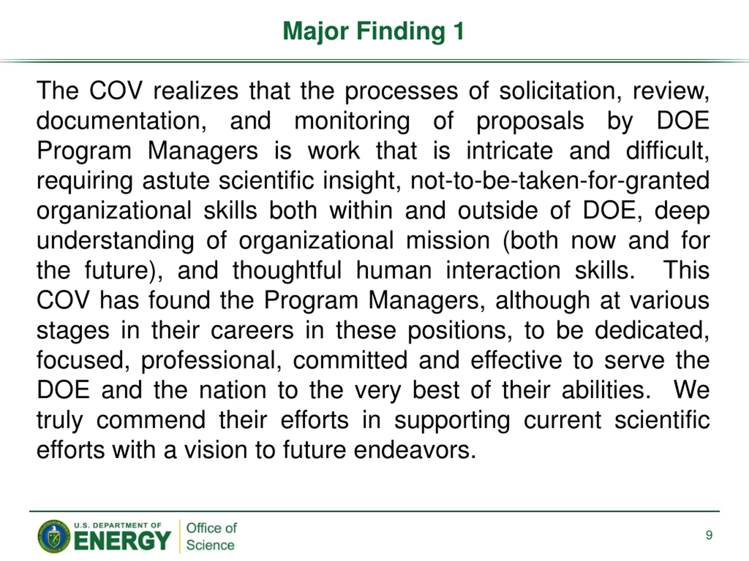Major Finding 1 The COV realizes that the processes of solicitation, review, documentation, and monitoring of proposals by DOE Program Managers is work that is intricate and difficult, requiring astute scientific insight, not-to-be-taken-for-granted organizational skills both within and outside of DOE, deep understanding of organizational mission (both now and for the future), and thoughtful human interaction skills. This COV has found the Program Managers, although at various stages in their careers in these positions, to be dedicated, focused, professional, committed and effective to serve the DOE and the nation to the very best of their abilities. We truly commend their efforts in supporting current scientific efforts with a vision to future endeavors. 9