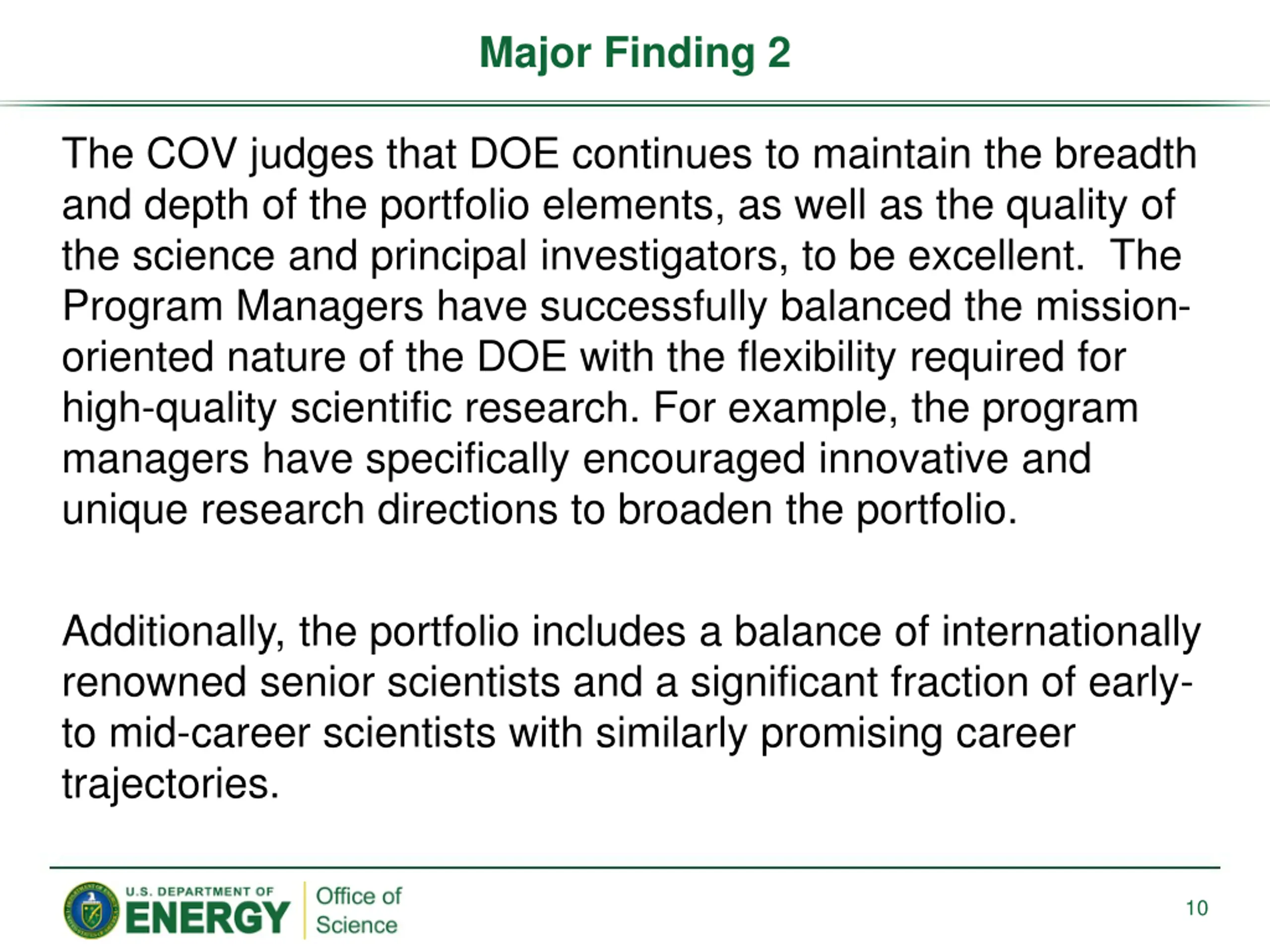 Major Finding 2 The COV judges that DOE continues to maintain the breadth and depth of the portfolio elements, as well as the quality of the science and principal investigators, to be excellent. The Program Managers have successfully balanced the mission- oriented nature of the DOE with the flexibility required for high-quality scientific research. For example, the program managers have specifically encouraged innovative and unique research directions to broaden the portfolio. Additionally, the portfolio includes a balance of internationally renowned senior scientists and a significant fraction of early- to mid-career scientists with similarly promising career trajectories. 10