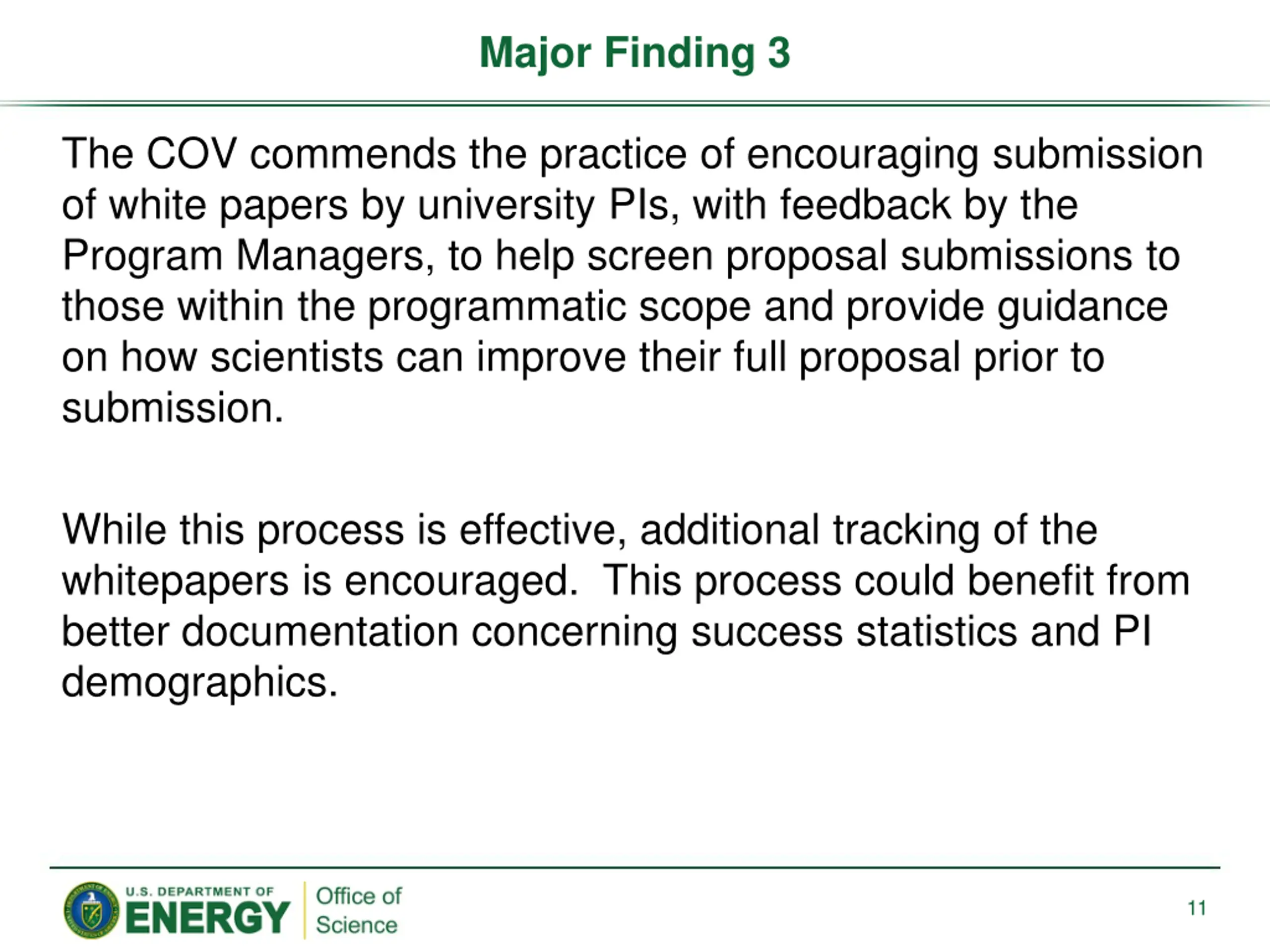 Major Finding 3 The COV commends the practice of encouraging submission of white papers by university PIs, with feedback by the Program Managers, to help screen proposal submissions to those within the programmatic scope and provide guidance on how scientists can improve their full proposal prior to submission. While this process is effective, additional tracking of the whitepapers is encouraged. This process could benefit from better documentation concerning success statistics and PI demographics. 11