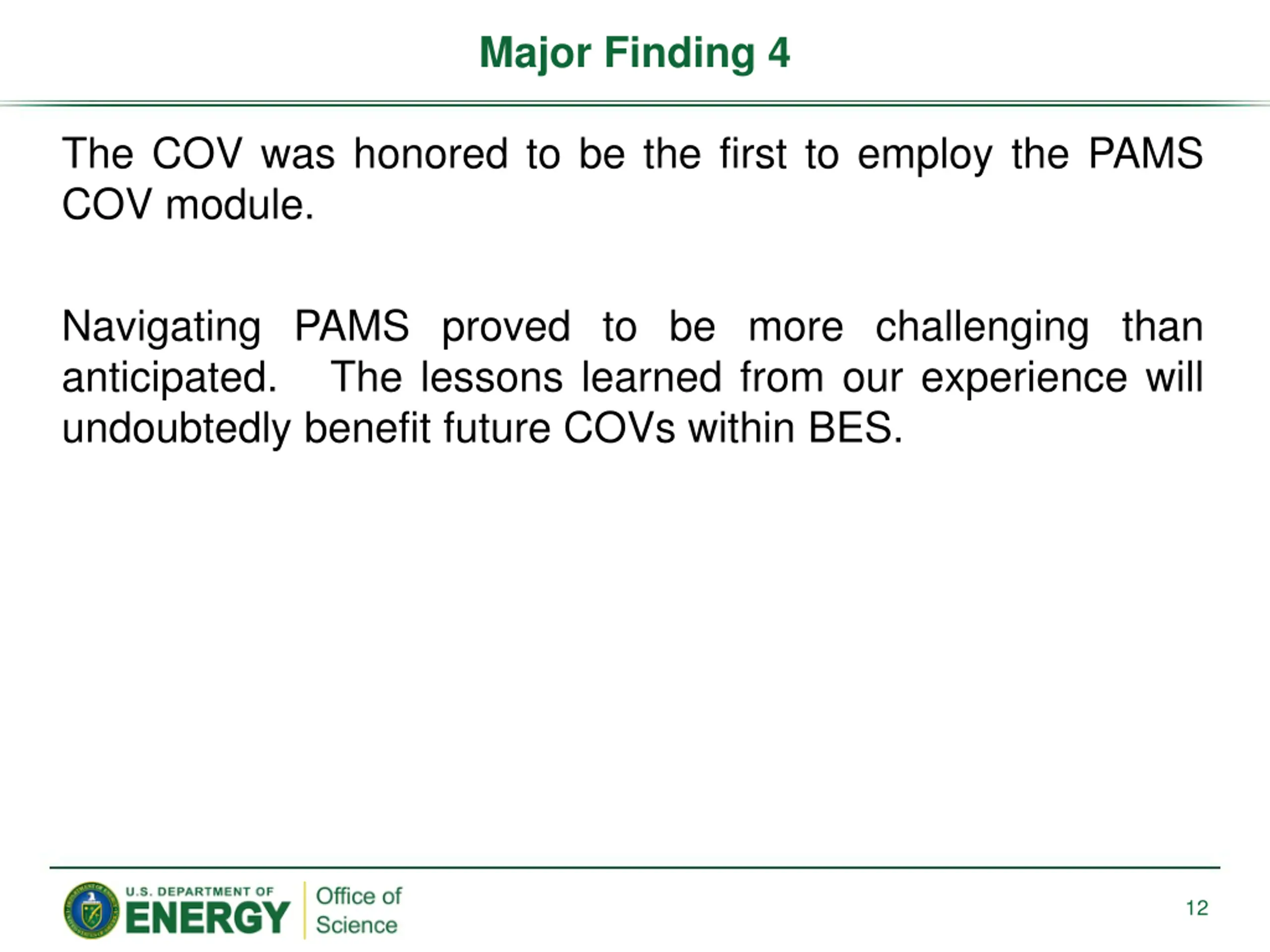 Major Finding 4 The COV was honored to be the first to employ the PAMS COV module. Navigating PAMS proved to be more challenging than anticipated. The lessons learned from our experience will undoubtedly benefit future COVs within BES. 12