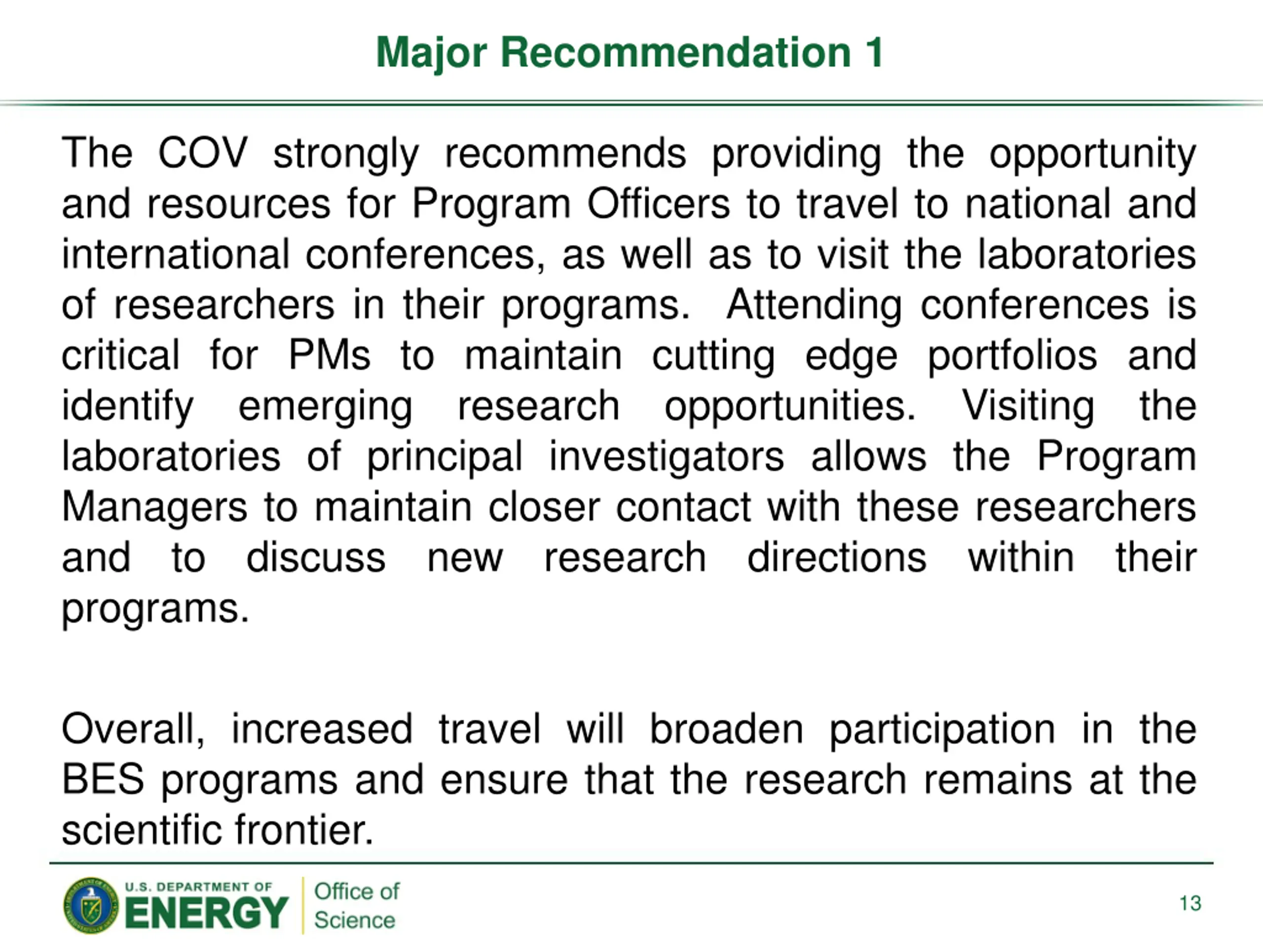 Major Recommendation 1 The COV strongly recommends providing the opportunity and resources for Program Officers to travel to national and international conferences, as well as to visit the laboratories of researchers in their programs. Attending conferences is critical for PMs to maintain cutting edge portfolios and identify emerging research opportunities. Visiting the laboratories of principal investigators allows the Program Managers to maintain closer contact with these researchers and to discuss new research directions within their programs. Overall, increased travel will broaden participation in the BES programs and ensure that the research remains at the scientific frontier. 13