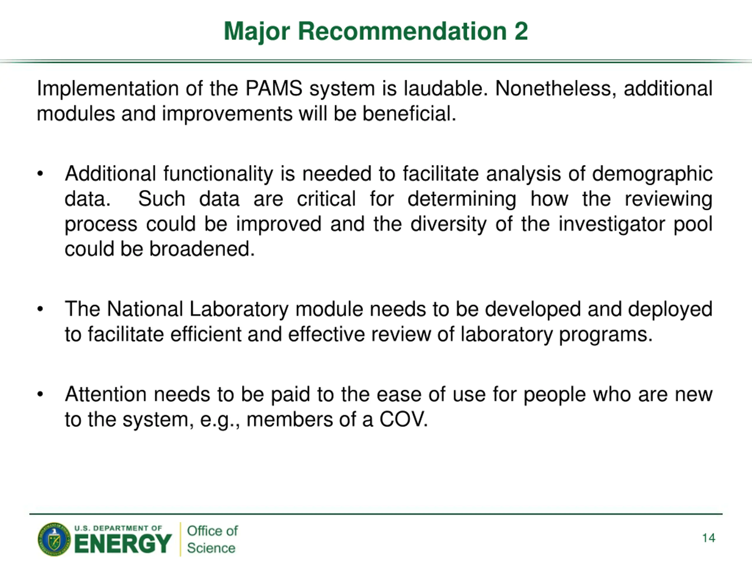Major Recommendation 2 Implementation of the PAMS system is laudable. Nonetheless, additional modules and improvements will be beneficial. Additional functionality is needed to facilitate analysis of demographic data. Such data are critical for determining how the reviewing process could be improved and the diversity of the investigator pool could be broadened. The National Laboratory module needs to be developed and deployed to facilitate efficient and effective review of laboratory programs. Attention needs to be paid to the ease of use for people who are new to the system, e.g., members of a COV. 14