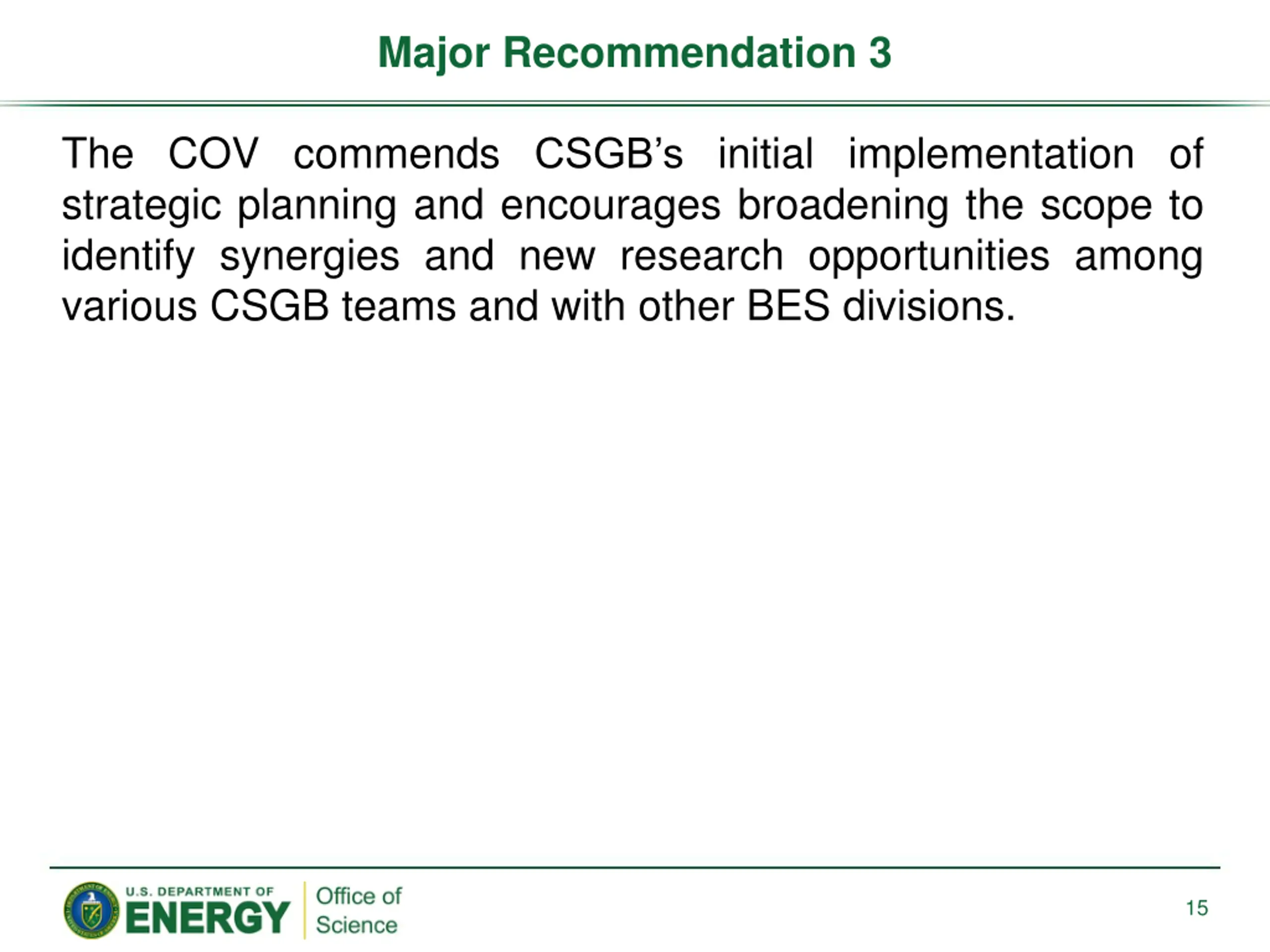 Major Recommendation 3 The COV commends CSGB s initial implementation of strategic planning and encourages broadening the scope to identify synergies and new research opportunities among various CSGB teams and with other BES divisions. 15