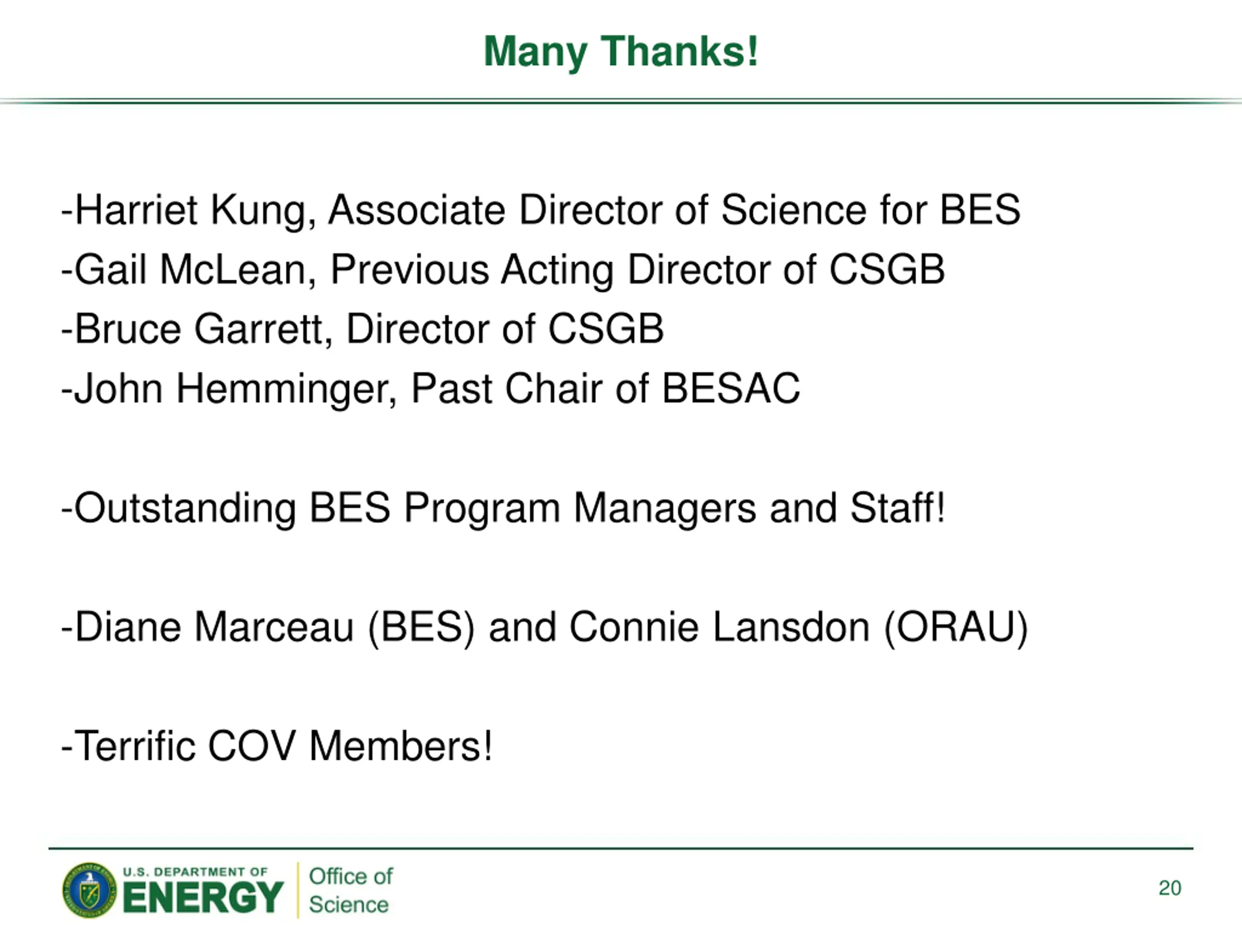 Many Thanks! -Harriet Kung, Associate Director of Science for BES -Gail McLean, Previous Acting Director of CSGB -Bruce Garrett, Director of CSGB -John Hemminger, Past Chair of BESAC -Outstanding BES Program Managers and Staff! -Diane Marceau (BES) and Connie Lansdon (ORAU) -Terrific COV Members! 20