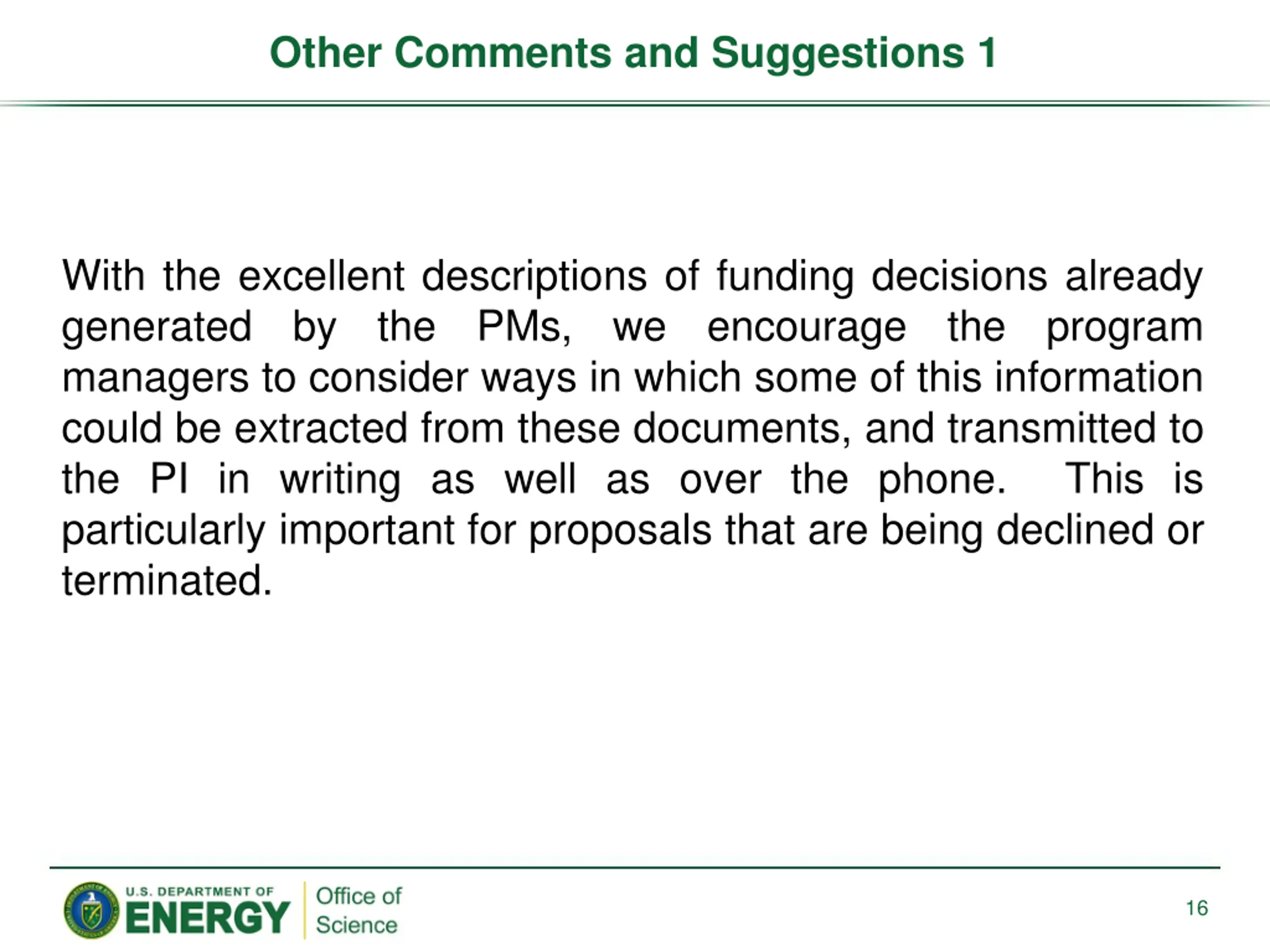 Other Comments and Suggestions 1 With the excellent descriptions of funding decisions already generated by the PMs, we encourage the program managers to consider ways in which some of this information could be extracted from these documents, and transmitted to the PI in writing as well as over the phone. This is particularly important for proposals that are being declined or terminated. 16