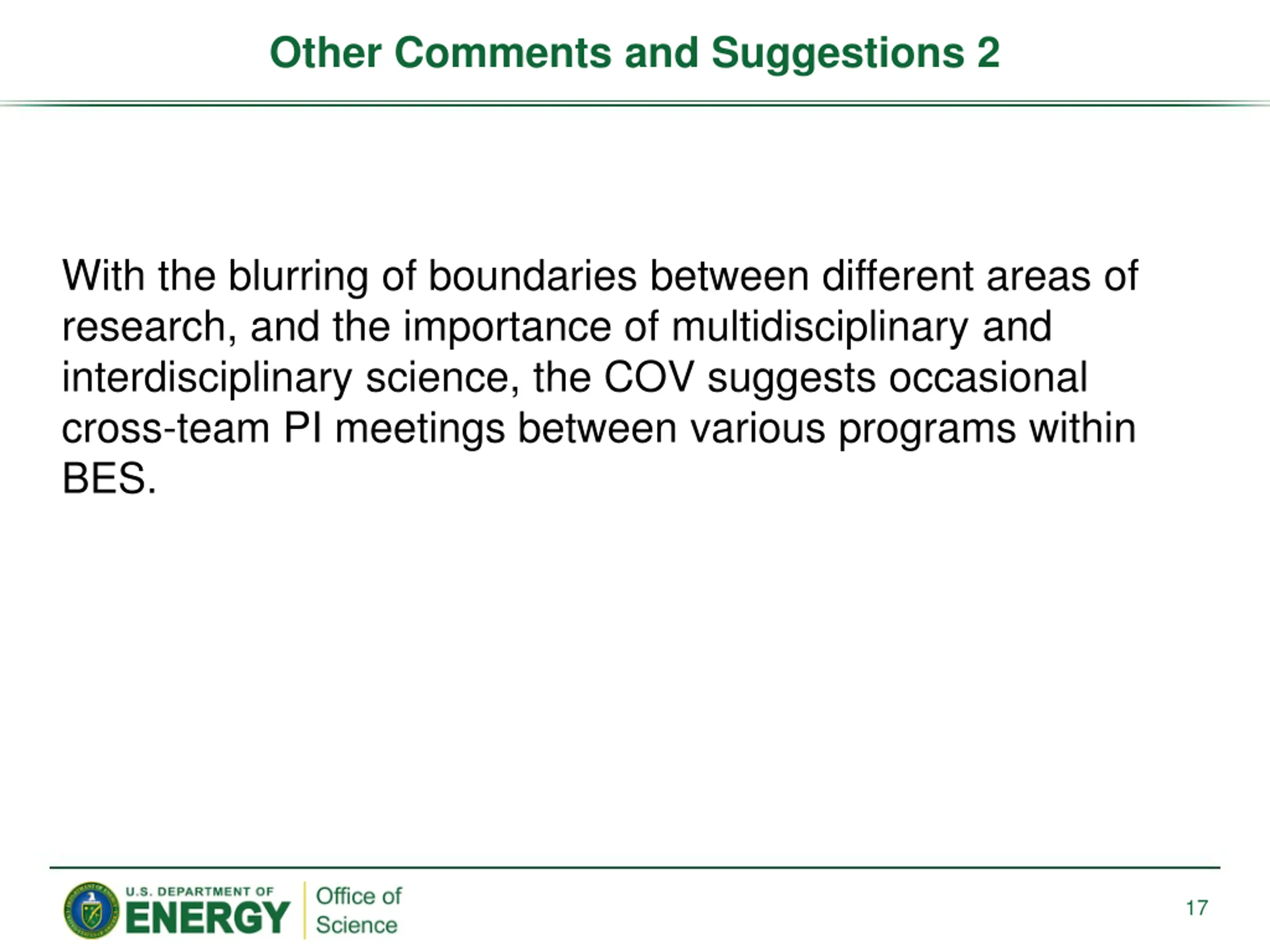 Other Comments and Suggestions 2 With the blurring of boundaries between different areas of research, and the importance of multidisciplinary and interdisciplinary science, the COV suggests occasional cross-team PI meetings between various programs within BES. 17