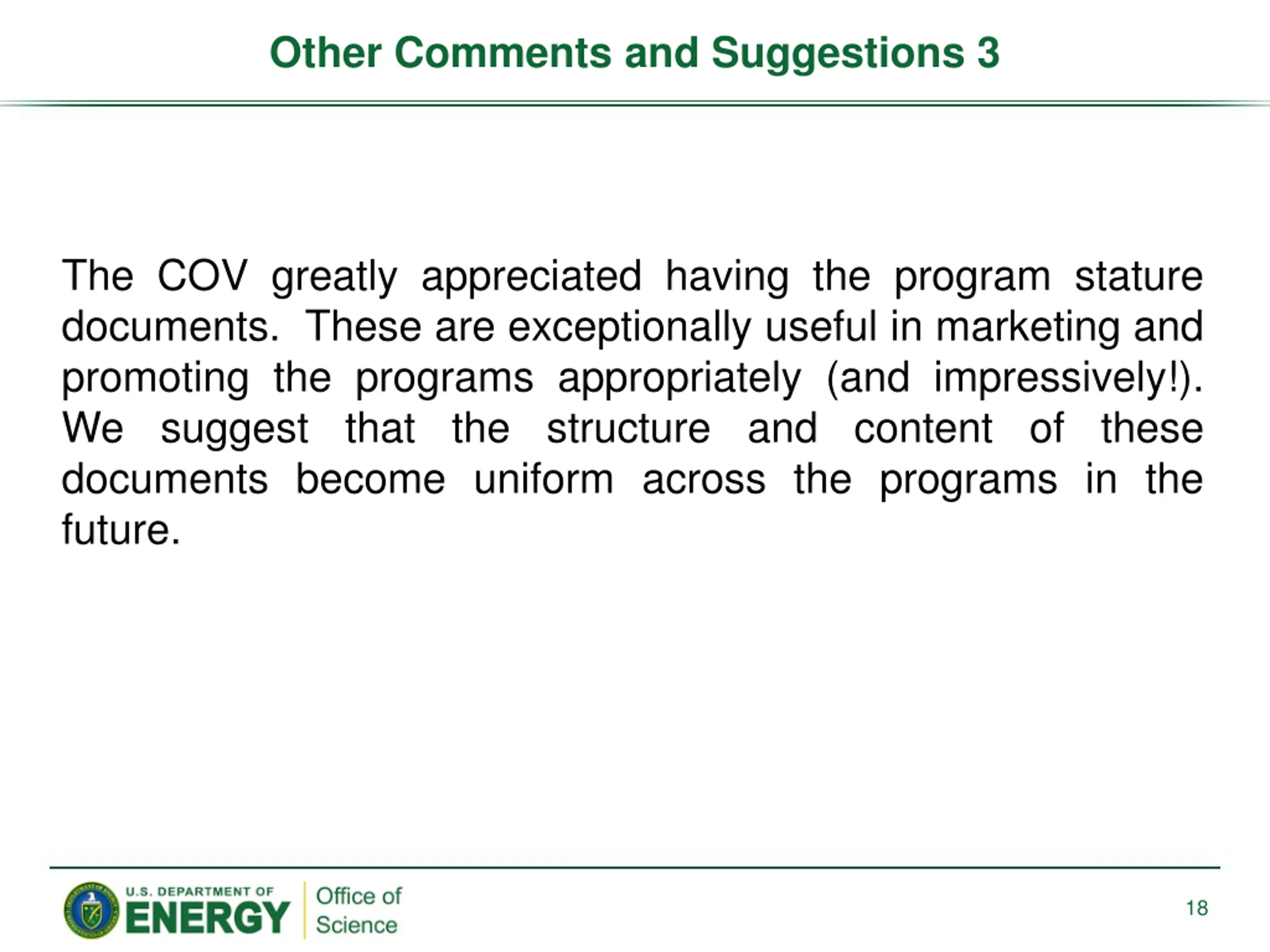 Other Comments and Suggestions 3 The COV greatly appreciated having the program stature documents. These are exceptionally useful in marketing and promoting the programs appropriately (and impressively!). We suggest that the structure and content of these documents become uniform across the programs in the future. 18