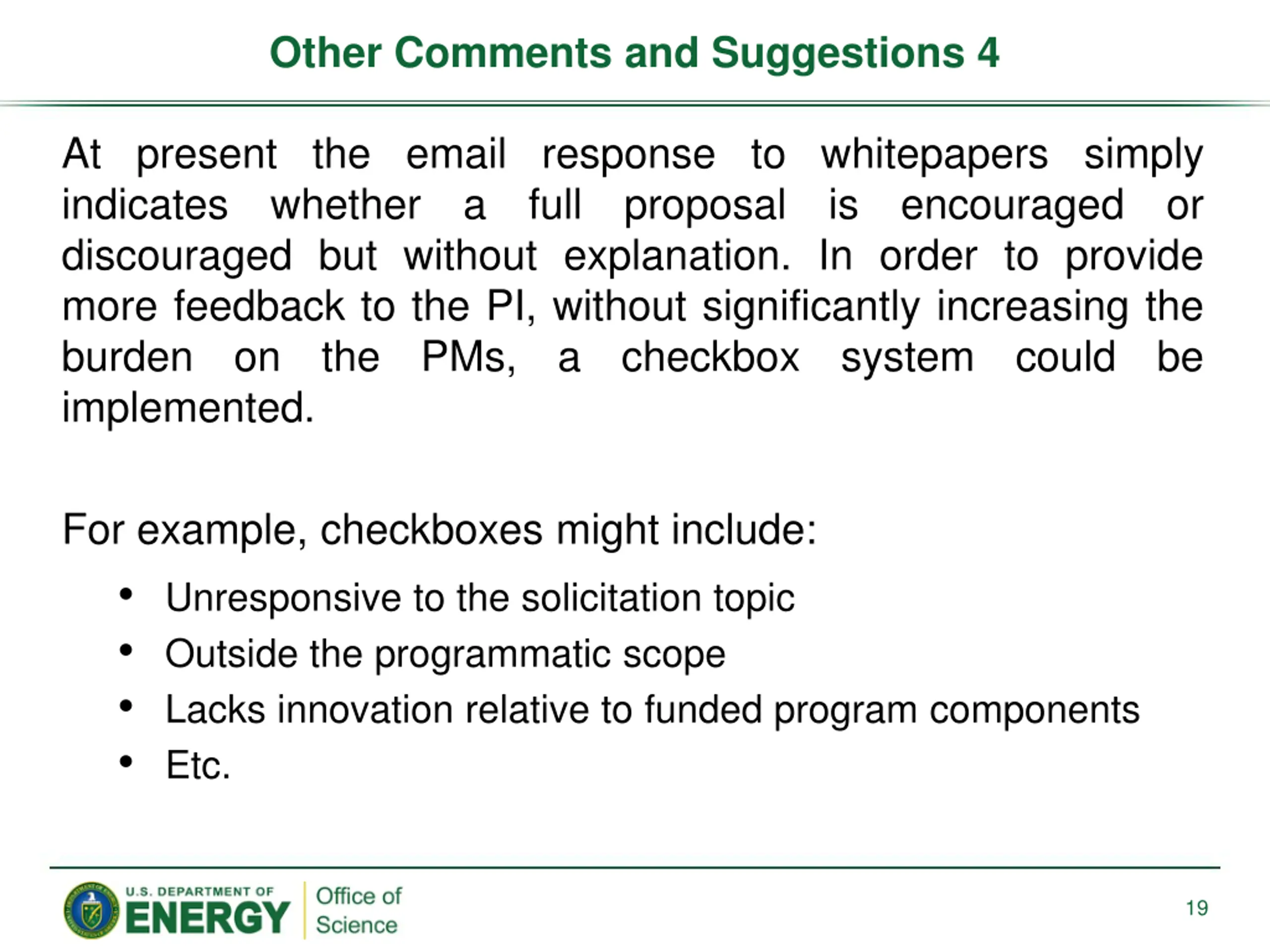 Other Comments and Suggestions 4 At present the email response to whitepapers simply indicates whether a full proposal is encouraged or discouraged but without explanation. In order to provide more feedback to the PI, without significantly increasing the burden on the PMs, a checkbox system could be implemented. For example, checkboxes might include: Unresponsive to the solicitation topic Outside the programmatic scope Lacks innovation relative to funded program components Etc. 19