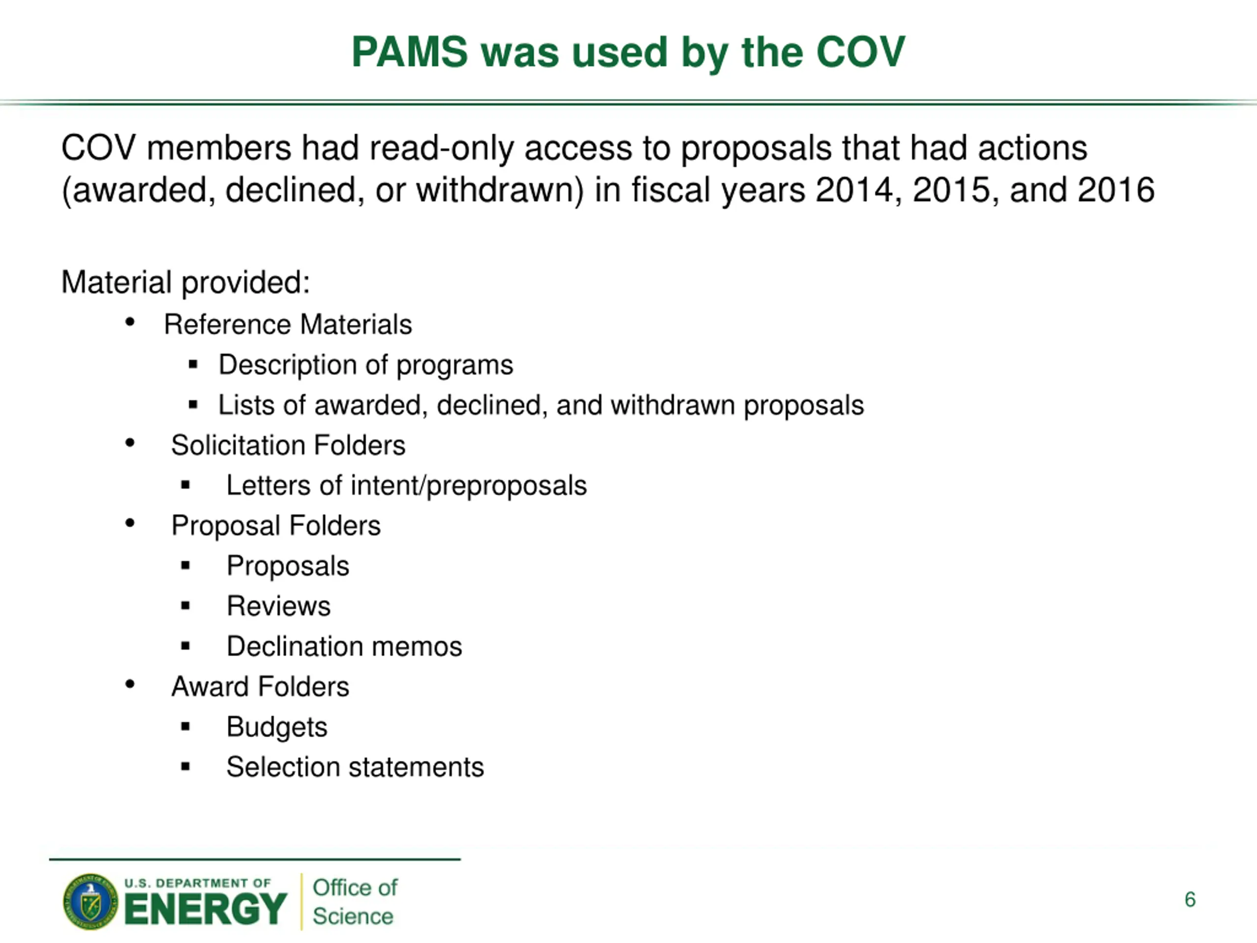 PAMS was used by the COV COV members had read-only access to proposals that had actions (awarded, declined, or withdrawn) in fiscal years 2014, 2015, and 2016 Material provided: Reference Materials Description of programs Lists of awarded, declined, and withdrawn proposals Solicitation Folders Letters of intent/preproposals Proposal Folders Proposals Reviews Declination memos Award Folders Budgets Selection statements 6