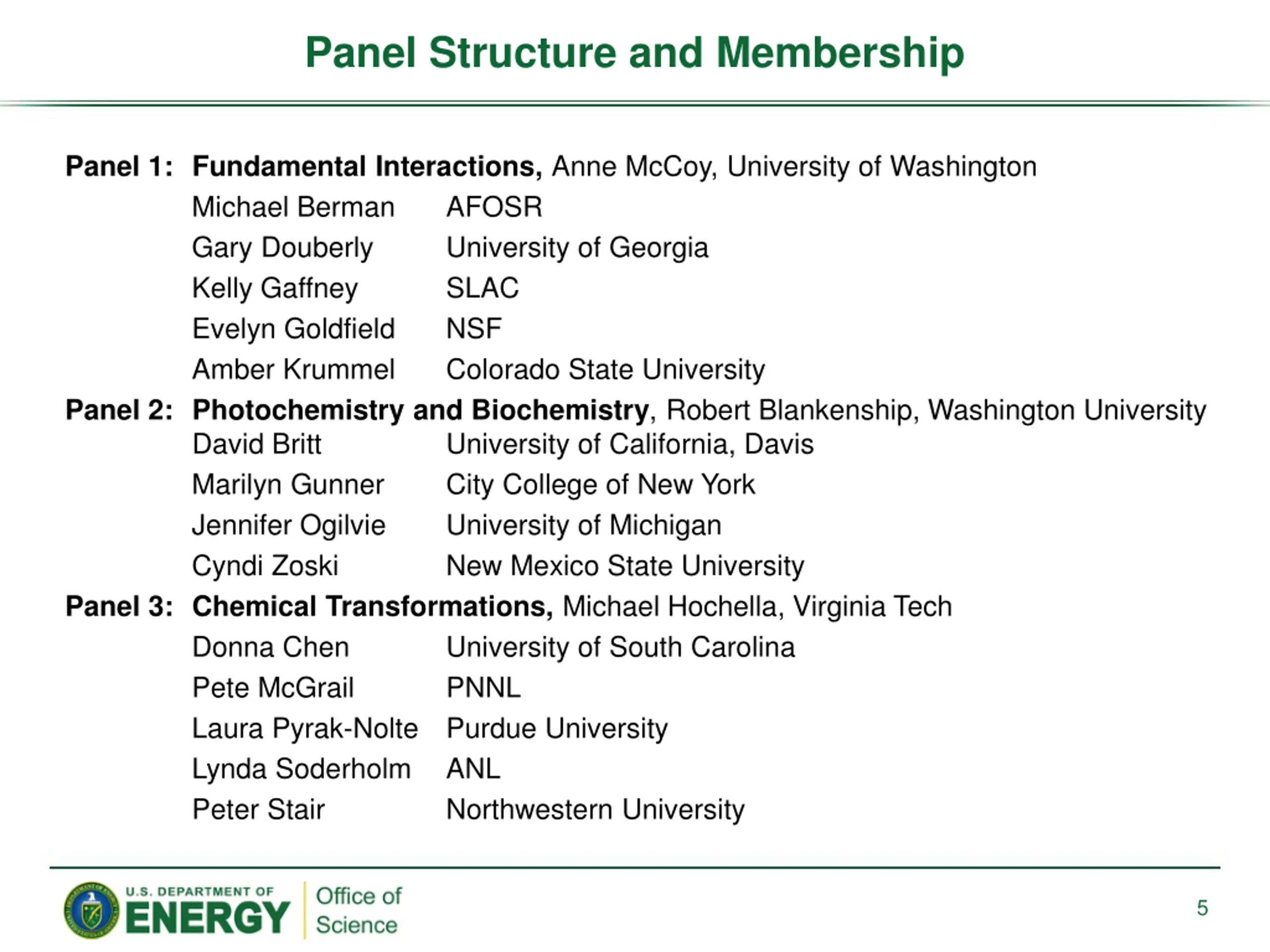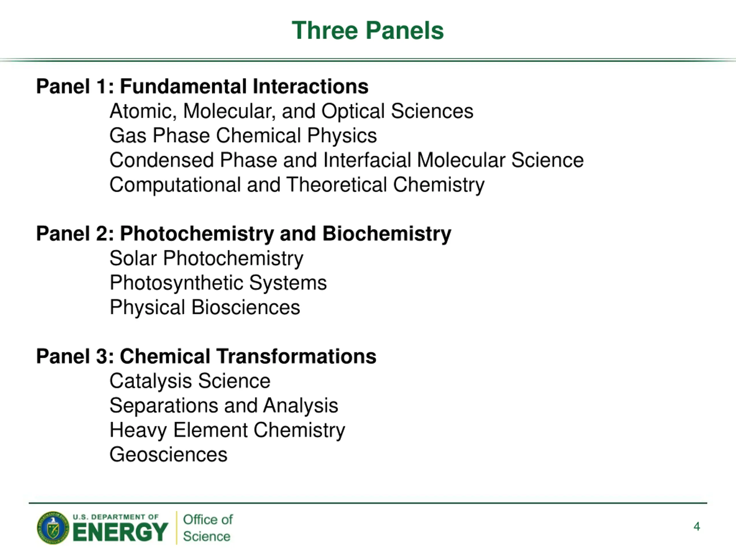 Three Panels Panel 1: Fundamental Interactions Atomic, Molecular, and Optical Sciences Gas Phase Chemical Physics Condensed Phase and Interfacial Molecular Science Computational and Theoretical Chemistry Panel 2: Photochemistry and Biochemistry Solar Photochemistry Photosynthetic Systems Physical Biosciences Panel 3: Chemical Transformations Catalysis Science Separations and Analysis Heavy Element Chemistry Geosciences 4