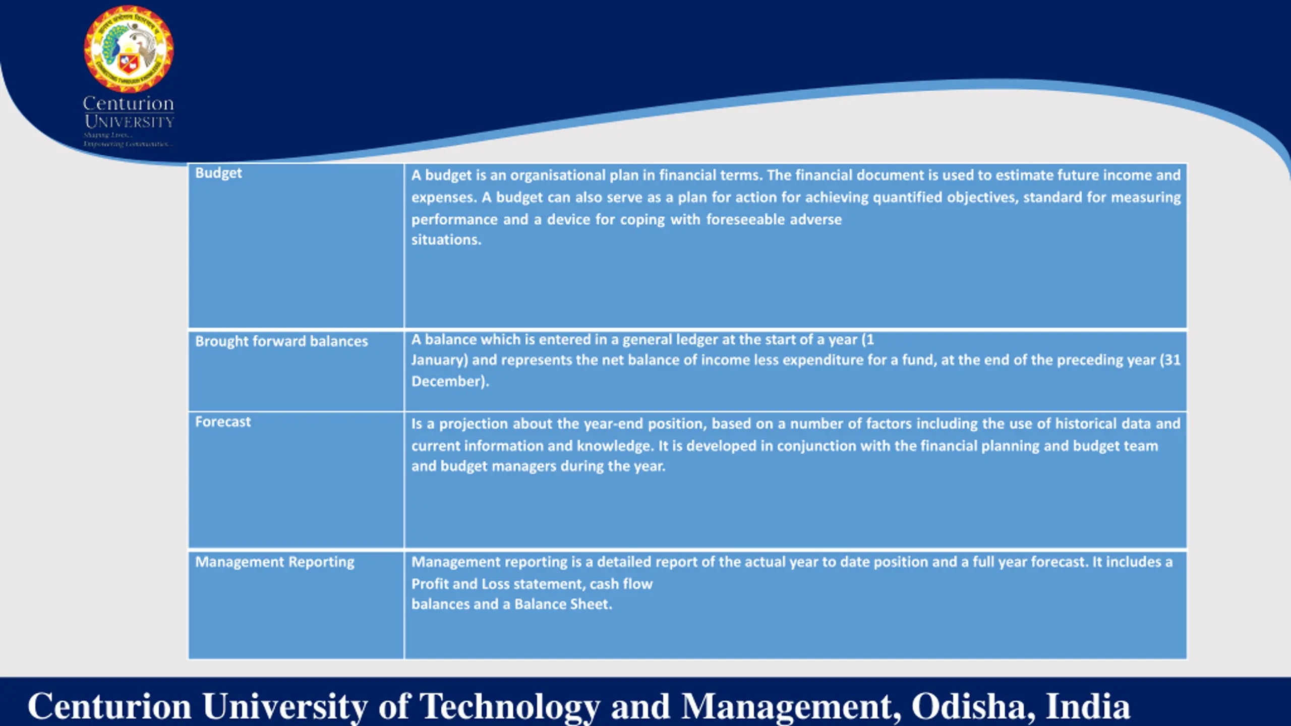 Budget A budget is an organisational plan in financial terms. The financial document is used to estimate future income and expenses. A budget can also serve as a plan for action for achieving quantified objectives, standard for measuring performance and a device for coping with foreseeable adverse situations. A balance which is entered in a general ledger at the start of a year (1 January) and represents the net balance of income less expenditure for a fund, at the end of the preceding year (31 December). Brought forward balances Forecast Is a projection about the year-end position, based on a number of factors including the use of historical data and current information and knowledge. It is developed in conjunction with the financial planning and budget team and budget managers during the year. Management Reporting Management reporting is a detailed report of the actual year to date position and a full year forecast. It includes a Profit and Loss statement, cash flow balances and a Balance Sheet. Centurion University of Technology and Management, Odisha, India