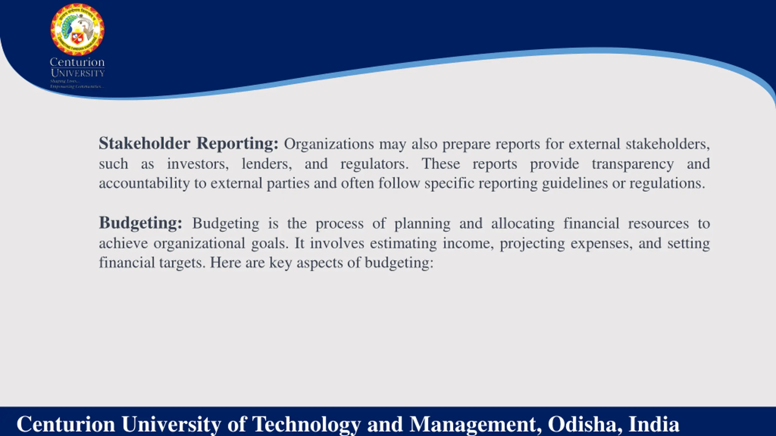 Stakeholder Reporting: Organizations may also prepare reports for external stakeholders, such as investors, lenders, and regulators. These reports provide transparency and accountability to external parties and often follow specific reporting guidelines or regulations. Budgeting: Budgeting is the process of planning and allocating financial resources to achieve organizational goals. It involves estimating income, projecting expenses, and setting financial targets. Here are key aspects of budgeting: Centurion University of Technology and Management, Odisha, India