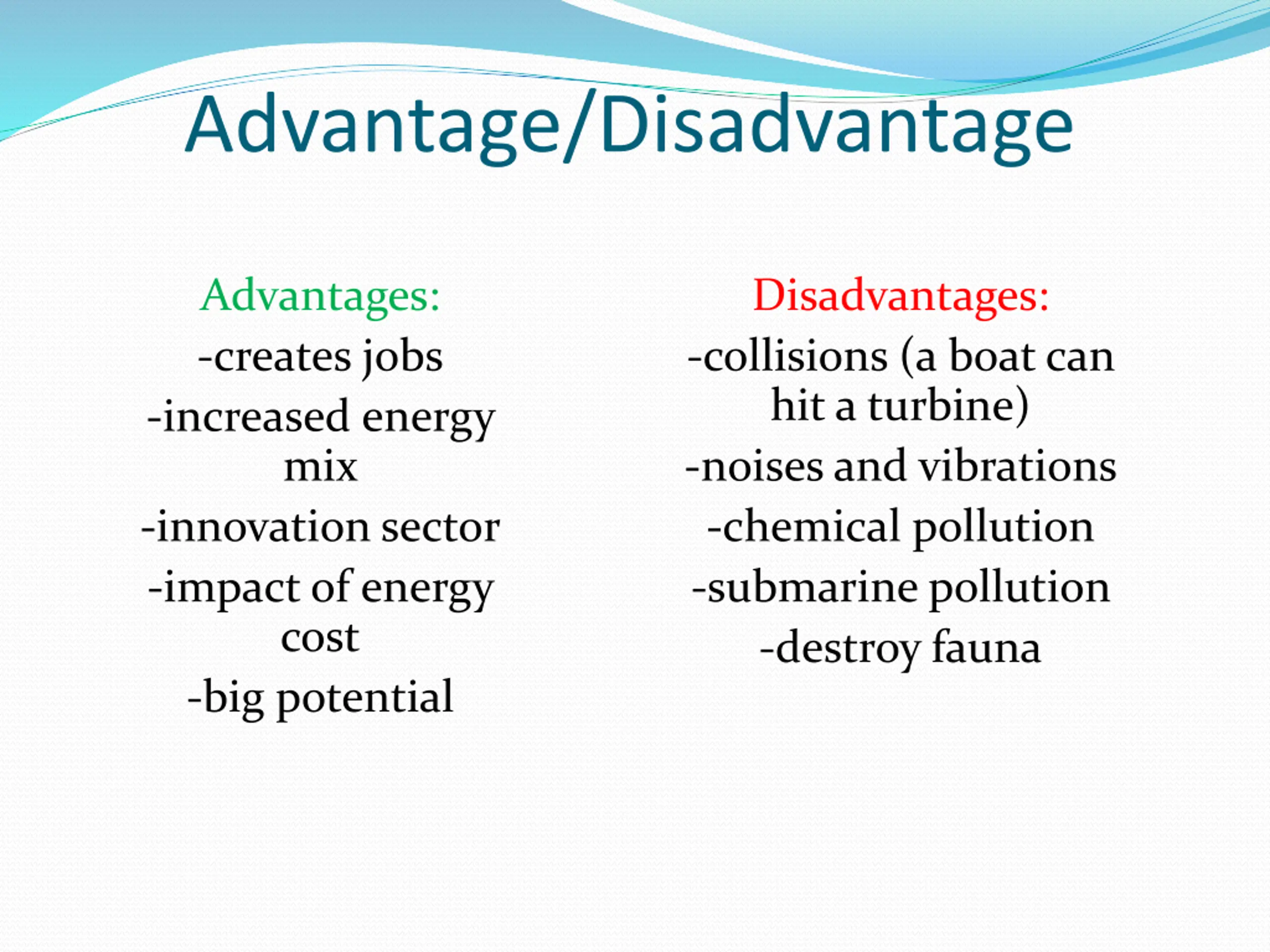 Advantage/Disadvantage Advantages: -creates jobs -increased energy mix -innovation sector -impact of energy cost -big potential Disadvantages: -collisions (a boat can hit a turbine) -noises and vibrations -chemical pollution -submarine pollution -destroy fauna