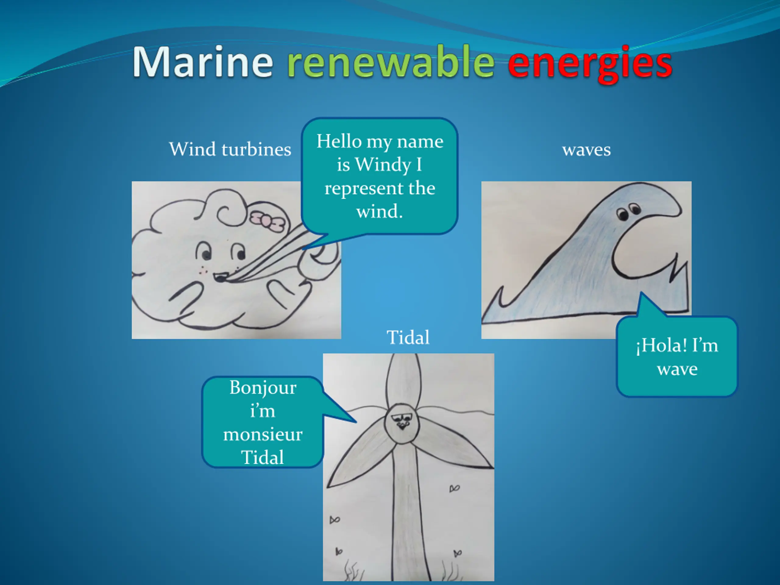 Hello my name is Windy I represent the wind. Wind turbines waves Tidal Hola! I m wave Bonjour i m monsieur Tidal