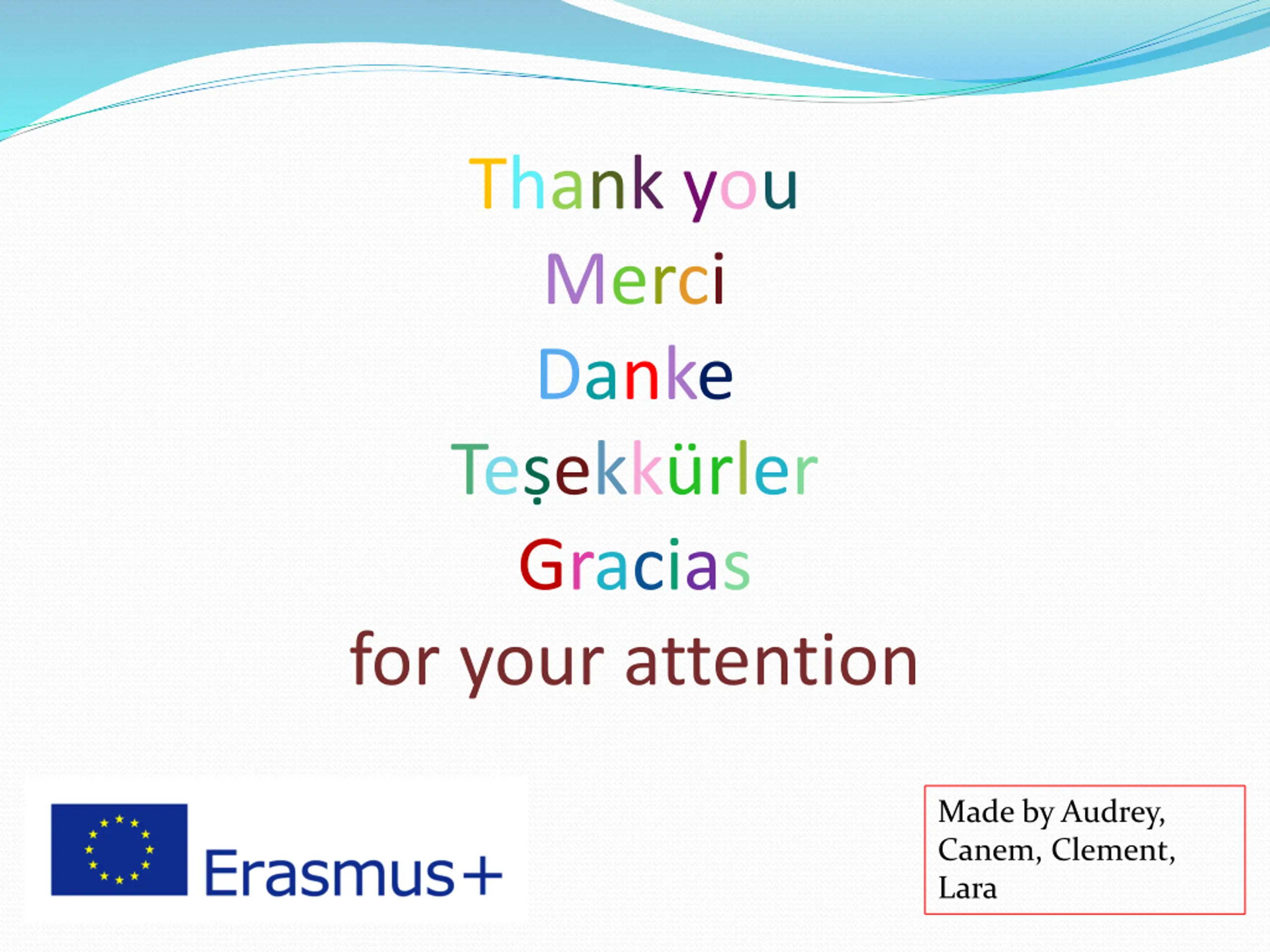 Thank you Merci Danke Te ekk rler Gracias for your attention Made by Audrey, Canem, Clement, Lara