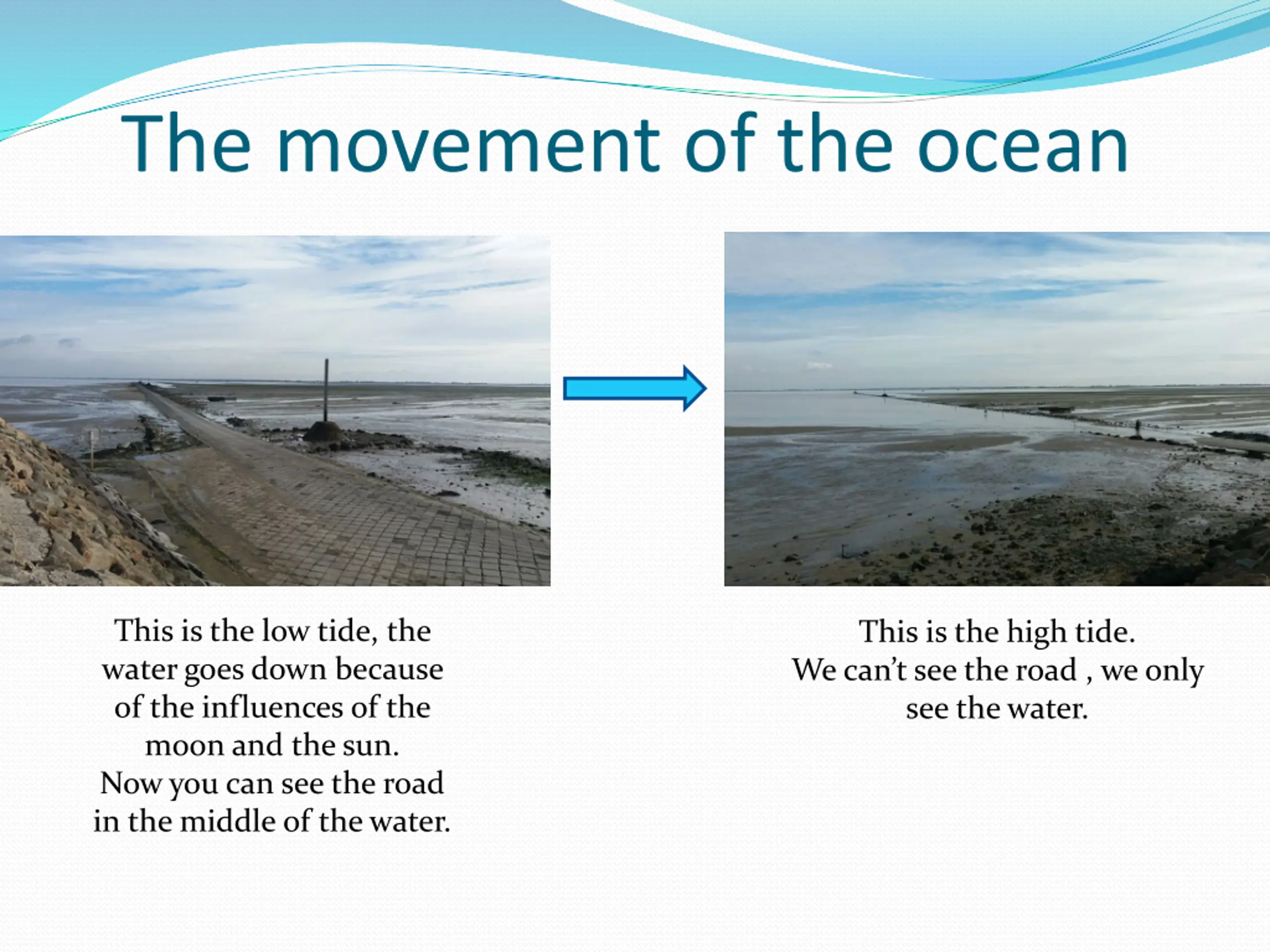 The movement of the ocean This is the low tide, the water goes down because of the influences of the moon and the sun. Now you can see the road in the middle of the water. This is the high tide. We can t see the road , we only see the water.