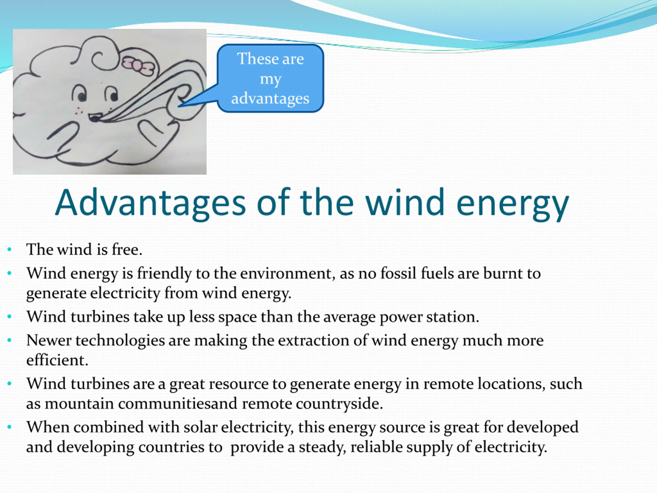 These are my advantages Advantages of the wind energy The wind is free. Wind energy is friendly to the environment, as no fossil fuels are burnt to generate electricity from wind energy. Wind turbines take up less space than the average power station. Newer technologies are making the extraction of wind energy much more efficient. Wind turbines are a great resource to generate energy in remote locations, such as mountain communitiesand remote countryside. When combined with solar electricity, this energy source is great for developed and developing countries to provide a steady, reliable supply of electricity.
